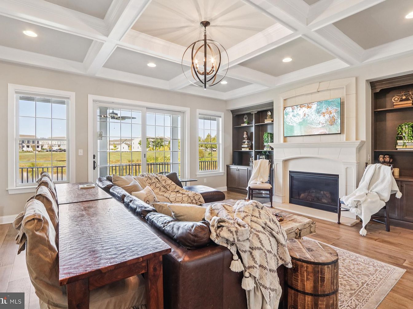 Spacious living area featuring a large brown leather sectional arranged to face a white stone fireplace with a mounted television above. Two armchairs with white throws flank the fireplace, adding symmetry and comfort. The room’s coffered ceiling is painted white with gray accents, complemented by a contemporary spherical chandelier. Built-in dark wood shelving on either side of the fireplace displays books, plants, and decorative objects. Three large windows and a glass door flood the space with natural light, offering views of a green backyard and neighboring homes. Warm tan walls, hardwood floors, and neutral-toned textiles create a cozy yet refined aesthetic.