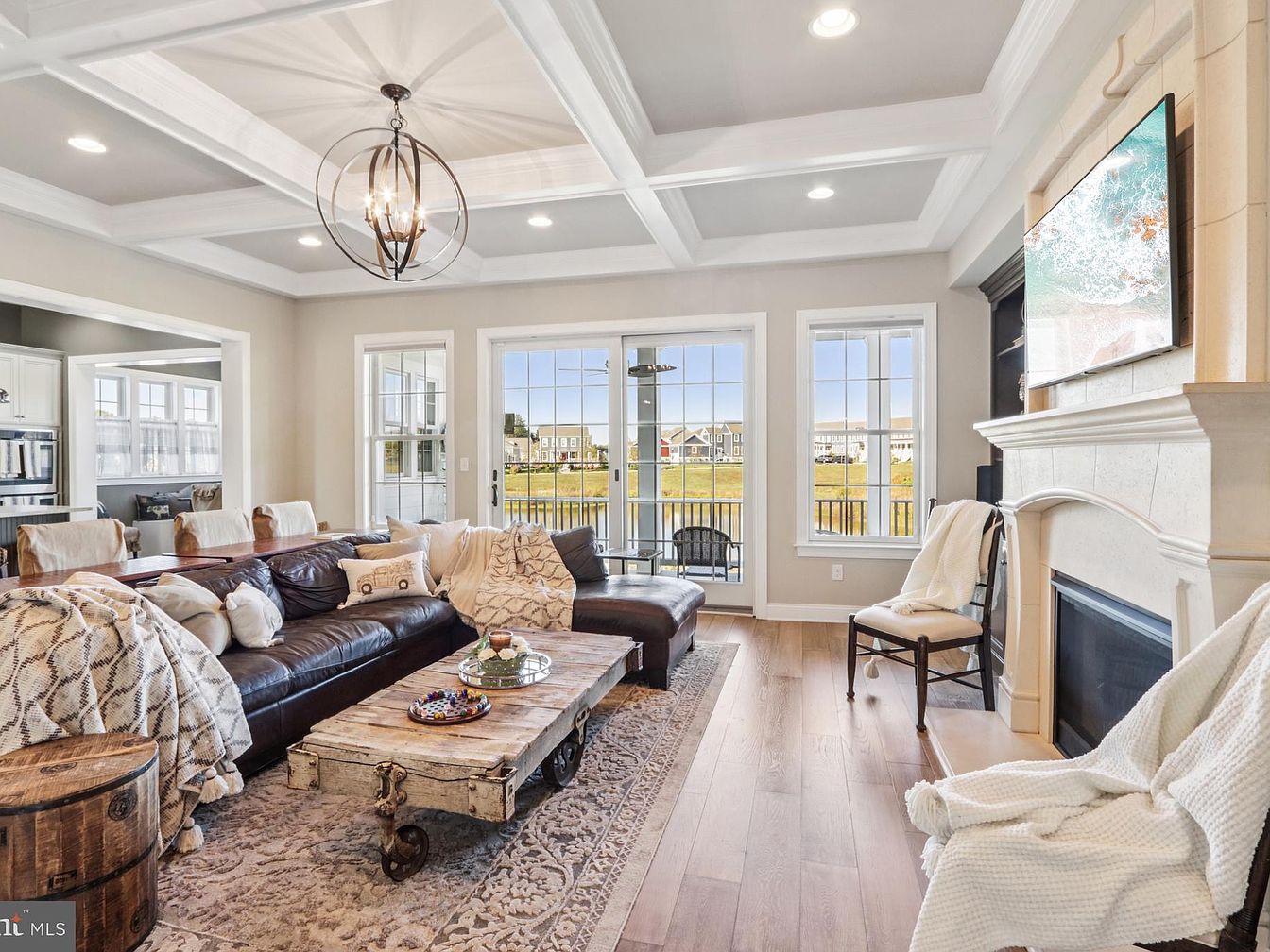 A spacious, bright living room featuring a large, dark brown leather sectional sofa arranged around a rustic, wheeled wooden coffee table. The room is adorned with plush pillows, knitted throws, and a detailed patterned area rug that softens the wooden floor. A grand, coffered ceiling with recessed lighting adds architectural interest above. Three large windows and a glass door fill the space with natural light and offer views of a lawn and neighborhood beyond. A traditional mantel fireplace anchors one wall, flanked by a cushioned chair and blanket, while a modern chandelier and mounted TV complete the stylish, welcoming atmosphere.