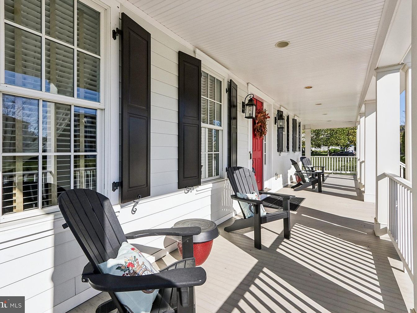 A spacious and inviting front porch featuring classic white wood siding and a ceiling with subtle grooved paneling. Black shutters frame the large grid windows, adding contrast and traditional charm. Four black Adirondack chairs are arranged along the porch, each paired with colorful cushions and small accent tables, perfect for relaxing and enjoying the outdoors. A vivid red front door adorned with a seasonal wreath provides a welcoming focal point. Two black carriage-style lantern wall lights flank the entry, and sturdy white columns support the porch roof, completing the timeless and friendly exterior aesthetic.