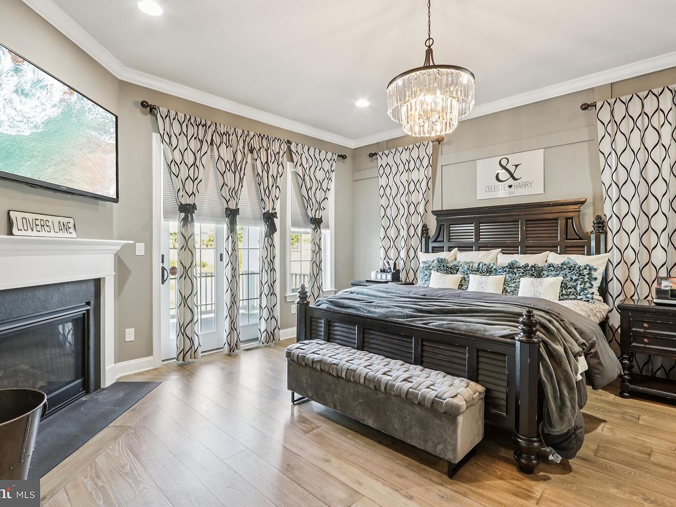 A spacious bedroom with a grand wooden headboard and frame, dressed in textured ruffled pillows and a plush gray comforter. Directly above the bed hangs a personalized wall sign, and a crystal chandelier serves as a central, elegant light fixture. The room features a wall of tall French doors, draped with geometric patterned curtains, allowing abundant natural light. A long, tufted gray bench rests at the foot of the bed, and matching bedside tables frame the sleeping area. Pale hardwood floors and light taupe walls contribute to the tranquil, contemporary atmosphere, while a corner fireplace and mounted TV add comfort.