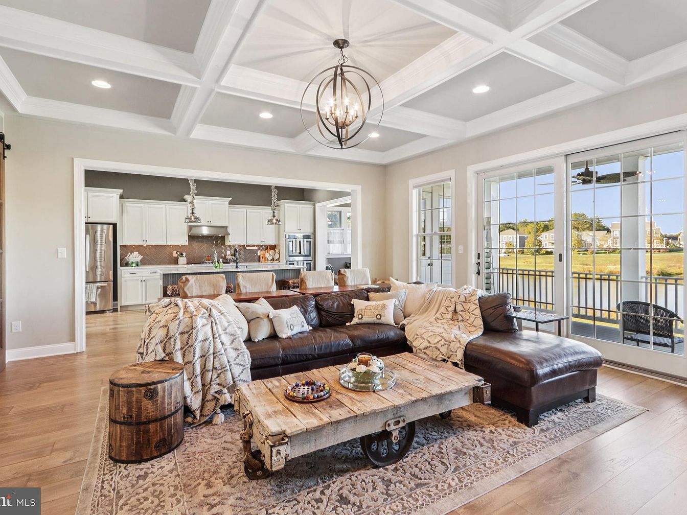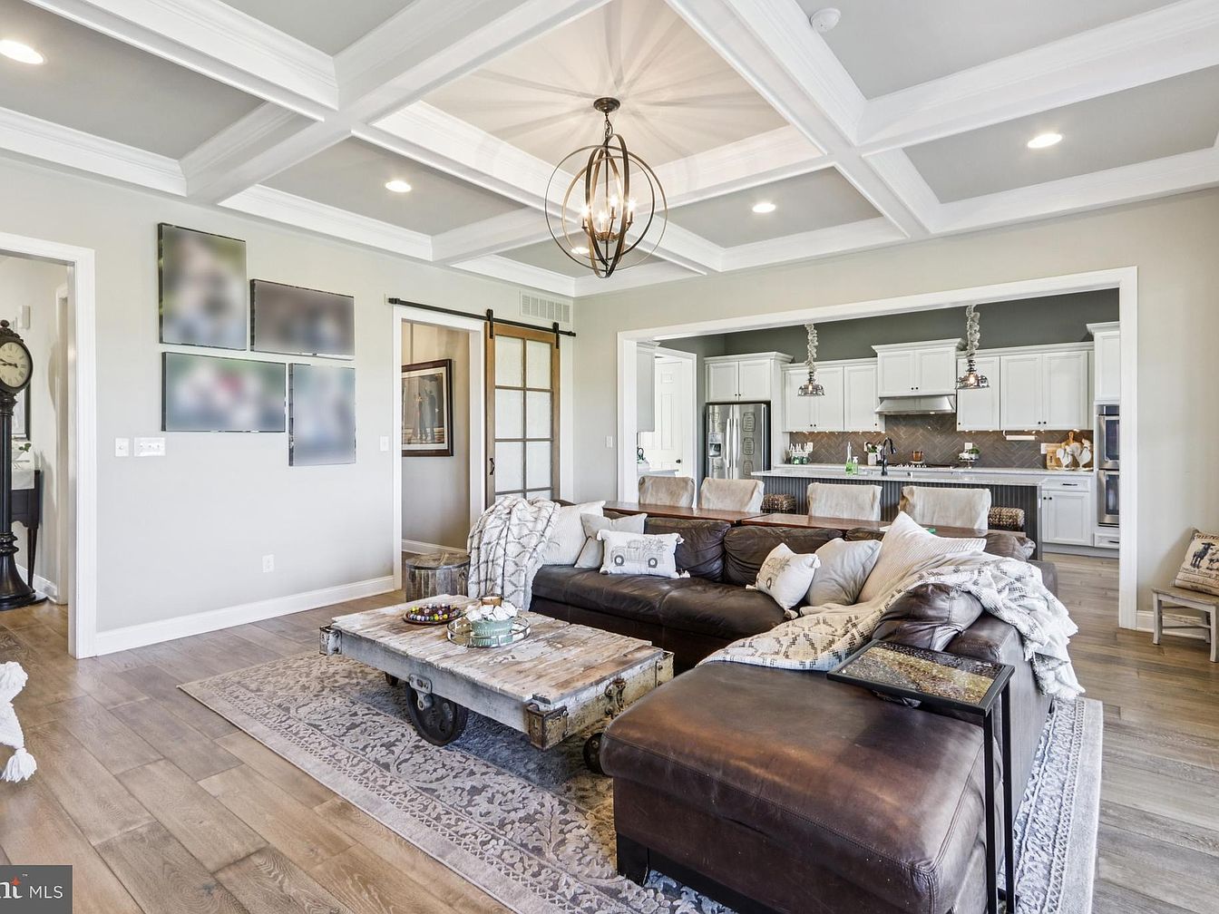 Spacious living room seamlessly connected to a modern kitchen, featuring a warm, neutral palette with soft gray walls and white trim. The ceiling is designed with prominent coffered beams and recessed lighting, adding architectural interest and a sense of depth. A large, dark brown leather sectional dominates the space, accented with patterned and neutral throw pillows. A rustic coffee table on wheels sits atop a subtle patterned area rug. The kitchen in the background includes white shaker cabinets, stainless steel appliances, and bar seating. Sliding barn-style doors, a tall grandfather clock, and elegant light fixtures give the space a blend of contemporary and vintage charm.