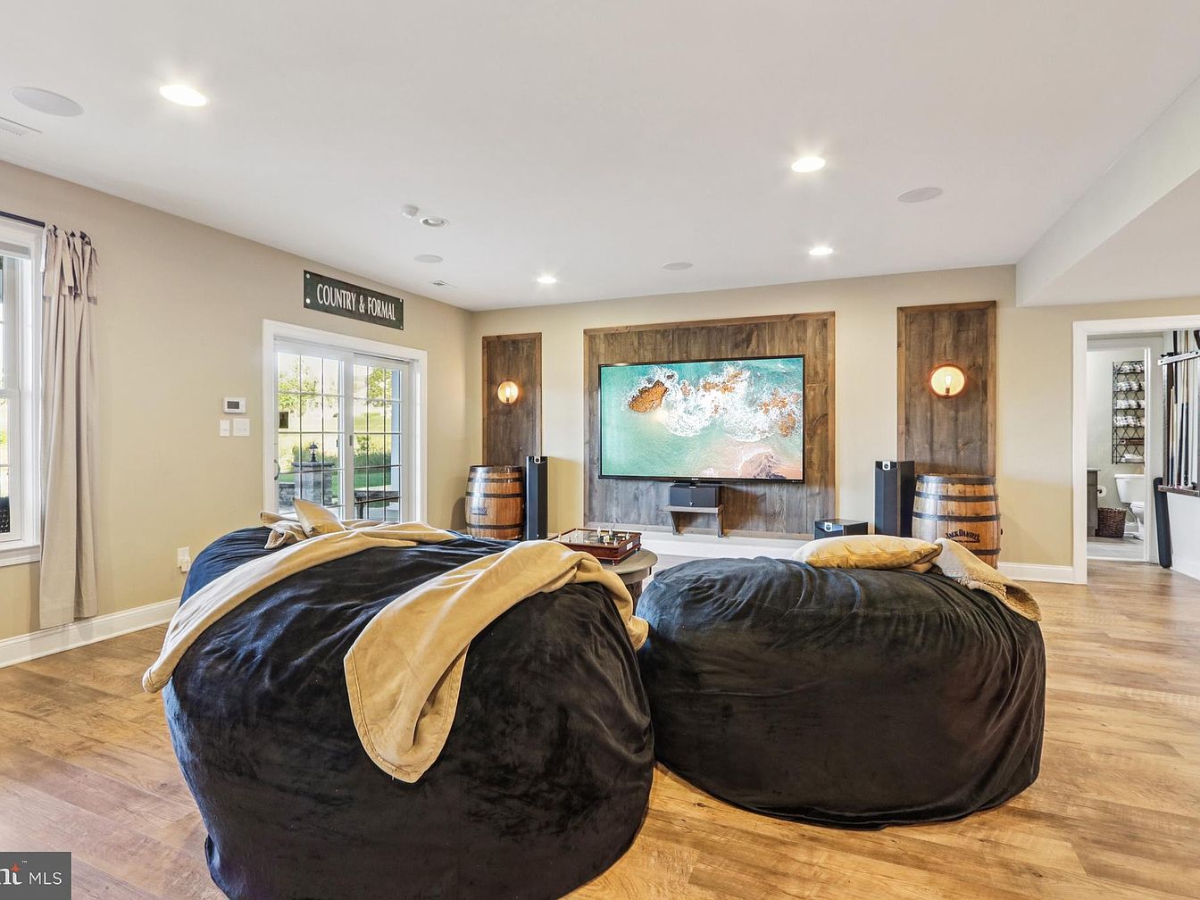 Spacious, open family room with warm, neutral walls and wide-plank medium wood flooring. The focal area is a large flat-screen television mounted on a feature wall with rustic wood paneling, flanked by decorative bourbon barrels and modern wall sconces. Large, extra-plush black bean bag chairs and golden tan throw blankets dominate the central seating area, offering a casual and cozy lounge space. A set of French doors with light curtains lets in natural light, while a small side table sits between seating. Off to one side, an opening leads to a bathroom, blending casual comfort with subtle historic charm.