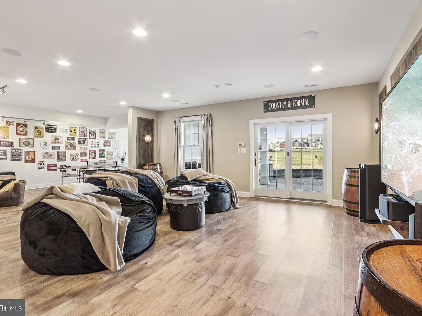 Spacious game room with light wood flooring and neutral beige walls, featuring three oversized black bean bag chairs arranged in the center, each draped with a light tan throw blanket. On the left wall, an eclectic gallery of vintage-style signs and posters adds visual interest above a ping-pong table. Large double glass doors and a window let in ample natural light, offering a view of a grassy yard outside. The room includes rustic touches with barrel side tables and a wall-mounted sign reading ‘Country & Formal.’ Modern recessed ceiling lights and minimalist decor contribute to a relaxed and welcoming atmosphere.