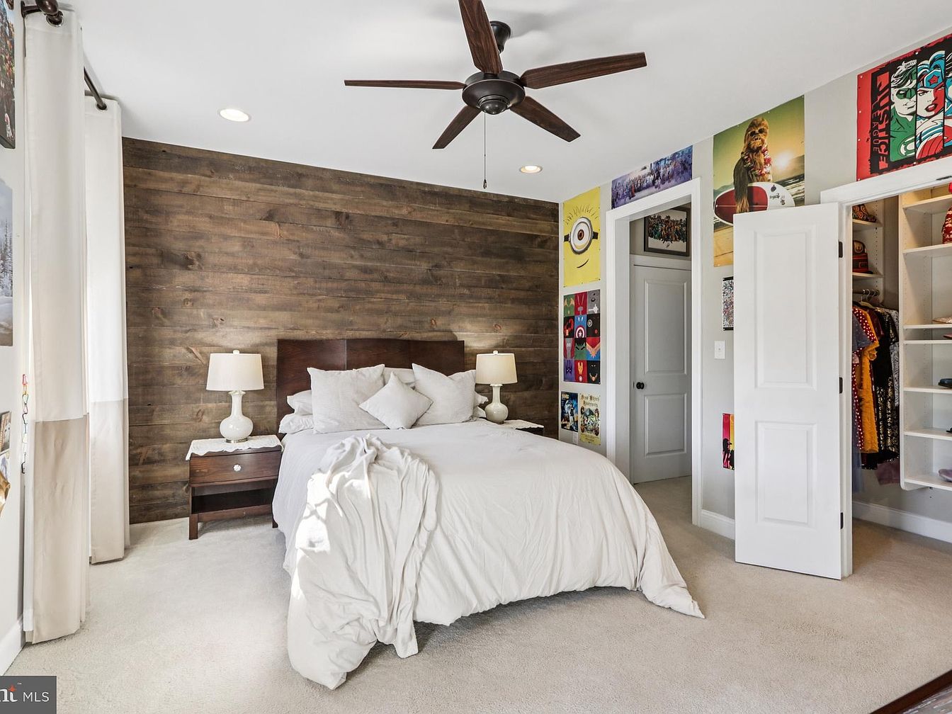 A cozy bedroom features a rustic wood accent wall behind a dark wood bed with crisp white bedding and multiple pillows. Pale carpeting and white walls lend a sense of lightness and airiness. On one side, floor-length white curtains flank a window, adding softness. On the adjacent wall, colorful pop art and character posters create a playful, creative vibe. Two matching bedside tables with lamps stand on either side of the bed. The ceiling has a large, dark wood fan. The doorway reveals a spacious walk-in closet with neatly arranged clothes on open white shelving.