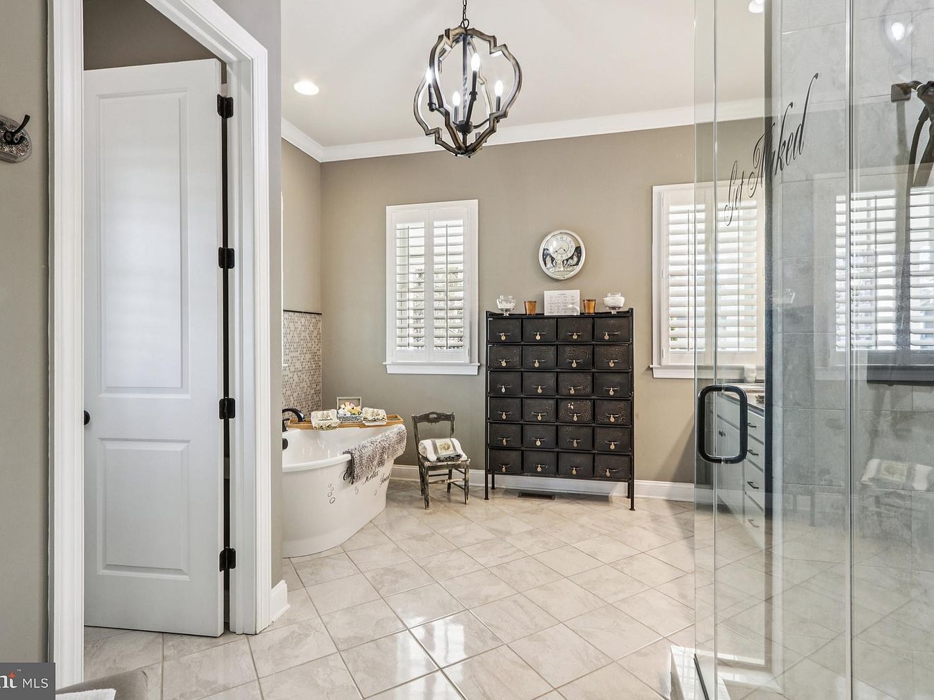 Spacious and elegant bathroom featuring polished beige tile flooring and taupe walls, accented by crisp white trim and crown molding. A freestanding soaking tub sits in a corner, paired with a rustic wooden tray and a textured towel draped over the edge. Opposite the tub, a black chest of drawers with many small compartments adds vintage charm, topped with decorative pieces and flanked by a small wooden chair. Two large shuttered windows allow natural light to fill the space. A modern glass shower enclosure and a striking geometric pendant light complete the sophisticated design.