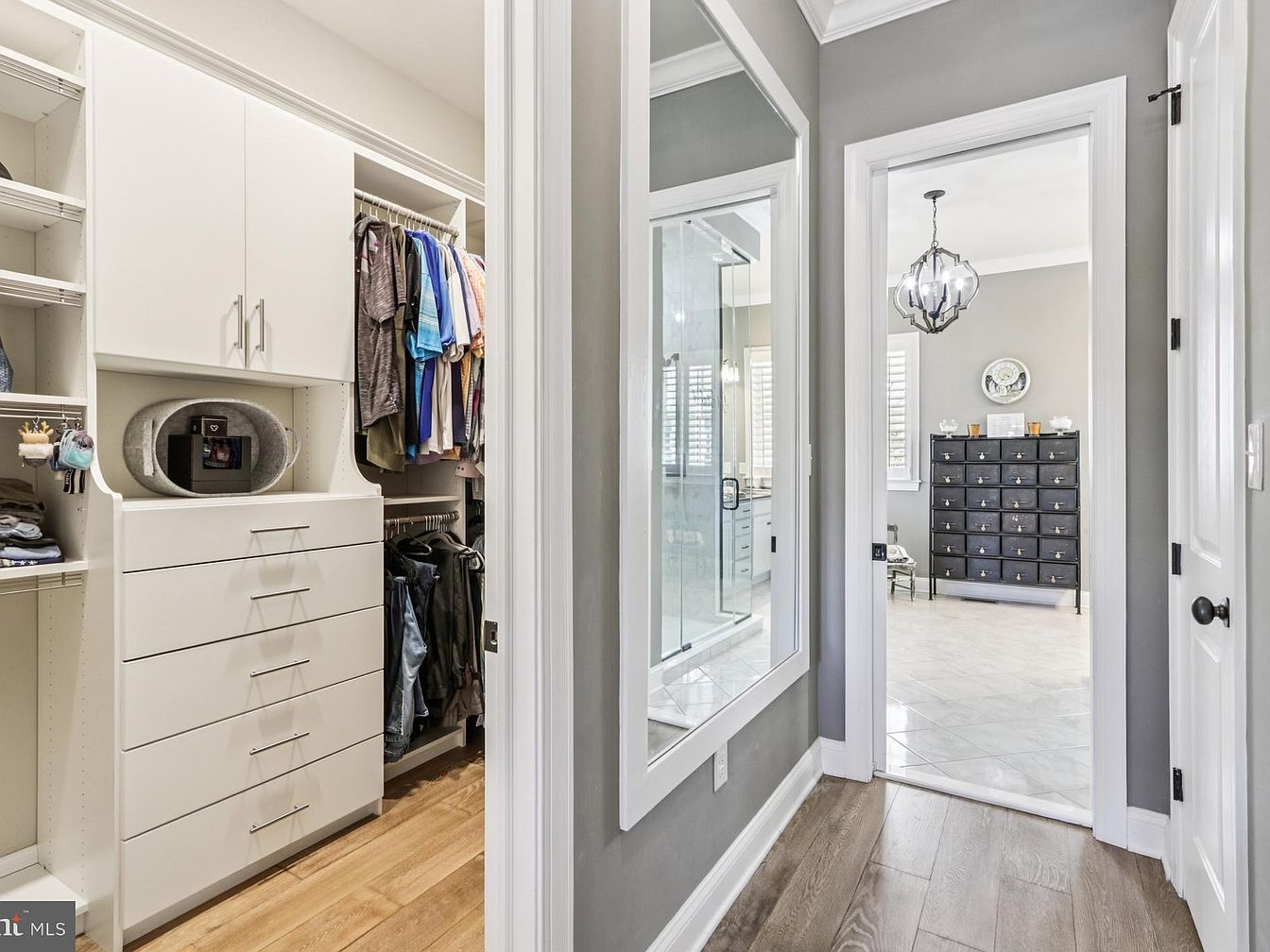 A spacious walk-in closet with crisp white built-in cabinets, sleek drawers, and open shelving organizes clothing and accessories. Light wood floors lead through a hallway with soft gray walls and white trim. A large mirror is mounted on the hallway wall, reflecting the adjacent spaces. Through an open doorway, a glimpse into another room reveals a modern black dresser with numerous small drawers and metallic handles, positioned under a contemporary geometric light fixture. Natural light pours in from plantation-shuttered windows, illuminating a neutral, sophisticated palette and creating a bright, welcoming atmosphere throughout this area.