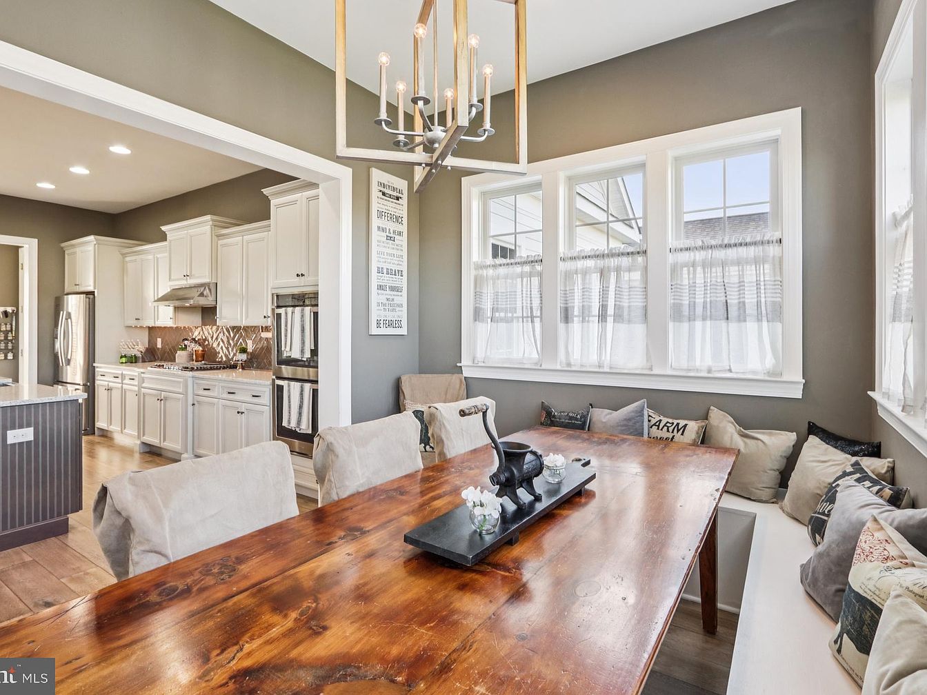 A cozy dining nook sits beside a series of large, bright windows, featuring a built-in white bench adorned with a collection of neutral-toned and farmhouse-style pillows. A substantial wooden table with a rich, amber finish anchors the eating area, complemented by slipcovered dining chairs. The adjacent kitchen area is designed with classic white cabinetry, stainless steel appliances, and subtle under-cabinet lighting. The two rooms are connected by a wide, open doorway, giving the space an airy, open feel. Soft grey-beige walls and light hardwood floors create a calm, inviting atmosphere with a modern farmhouse aesthetic.