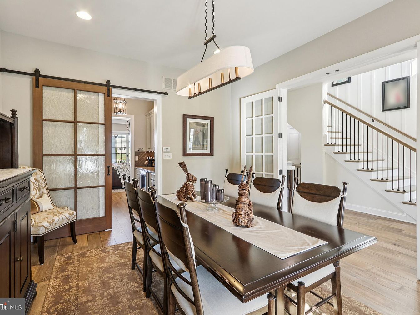 A rectangular wooden dining table with padded chairs sits at the center, adorned with a neutral runner and decorative woven animal figures as a centerpiece. The room features soft taupe walls and warm wooden floors, anchored by a subtle-patterned area rug. To the left, an antique high-backed chair in pale upholstery and a dark wood sideboard add a touch of formality. Sliding wooden doors with glass panes provide separation from an adjacent space. French doors open to a hallway where a staircase with elegant wooden railing ascends, all infused with abundant natural light for an open, airy atmosphere.