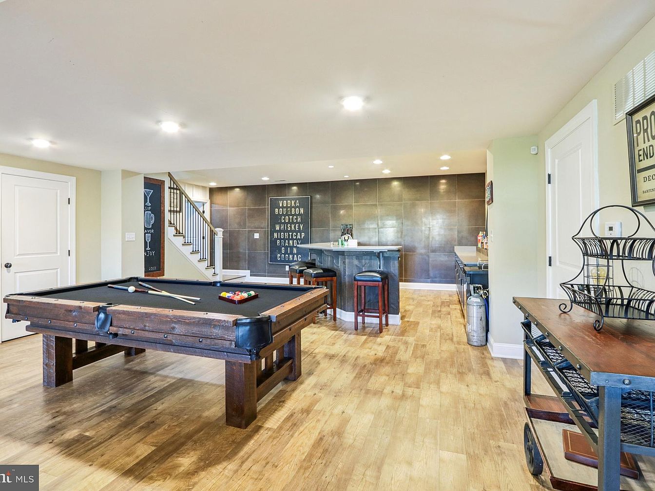 A spacious basement game room features light wood floors and neutral cream walls, creating a welcoming, relaxed atmosphere. A sturdy dark wood pool table sits at the center, with cues and billiard balls neatly arranged on top. Toward the back, an open bar area with a long gray countertop and three barstools offers a spot for entertaining. The back wall is finished with sleek, large tiles in a deep brown, displaying a chic, industrial vibe. Modern recessed lighting brightens the space, and playful, oversized typography art lists various spirits, enhancing the fun, casual aesthetic. A black metal rolling cart adds functional style by the door.
