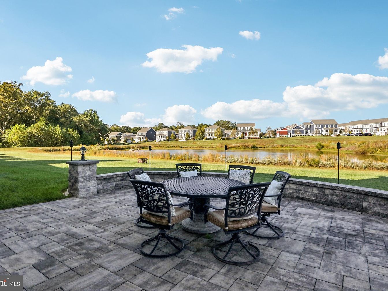A spacious patio set overlooking a serene pond, framed by lush green lawns and distant residential homes. The patio floor features large, textured gray pavers arranged in a geometric pattern. At the center sits a round, ornate metal table surrounded by five black wrought-iron chairs, each with light tan seat cushions and white decorative pillows. Low stone half-walls border the patio, accented at each end with stone columns topped by lantern-style lights. The setting creates a relaxed, inviting outdoor living space, perfect for enjoying the water view and natural surroundings under a wide, bright blue sky.