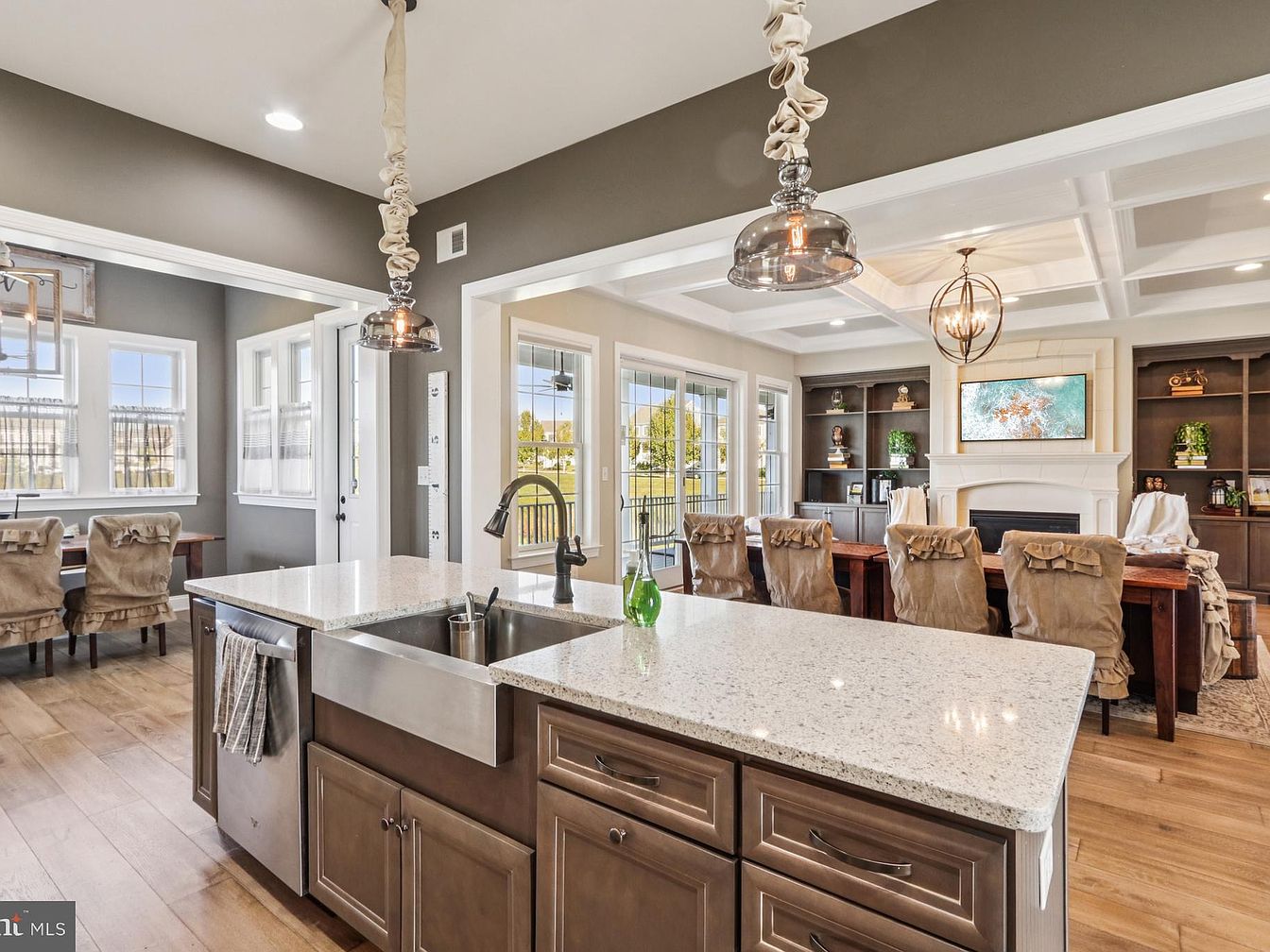 Spacious kitchen featuring a large, light granite-topped island with a stainless-steel farmhouse sink and deep wooden cabinetry. Overhead, two pendant lights with glass domes and decorative cloth-wrapped cords create warm ambiance. The kitchen opens seamlessly into an inviting living and dining area, with upholstered chairs around a sizeable wood table. Built-in shelving, a prominent white fireplace, and a tray ceiling with modern lighting fill the living space. Pale wooden floors run throughout, complementing taupe-gray walls and abundant natural light from multiple windows and patio doors. The aesthetic blends traditional and contemporary elements for a welcoming feel.