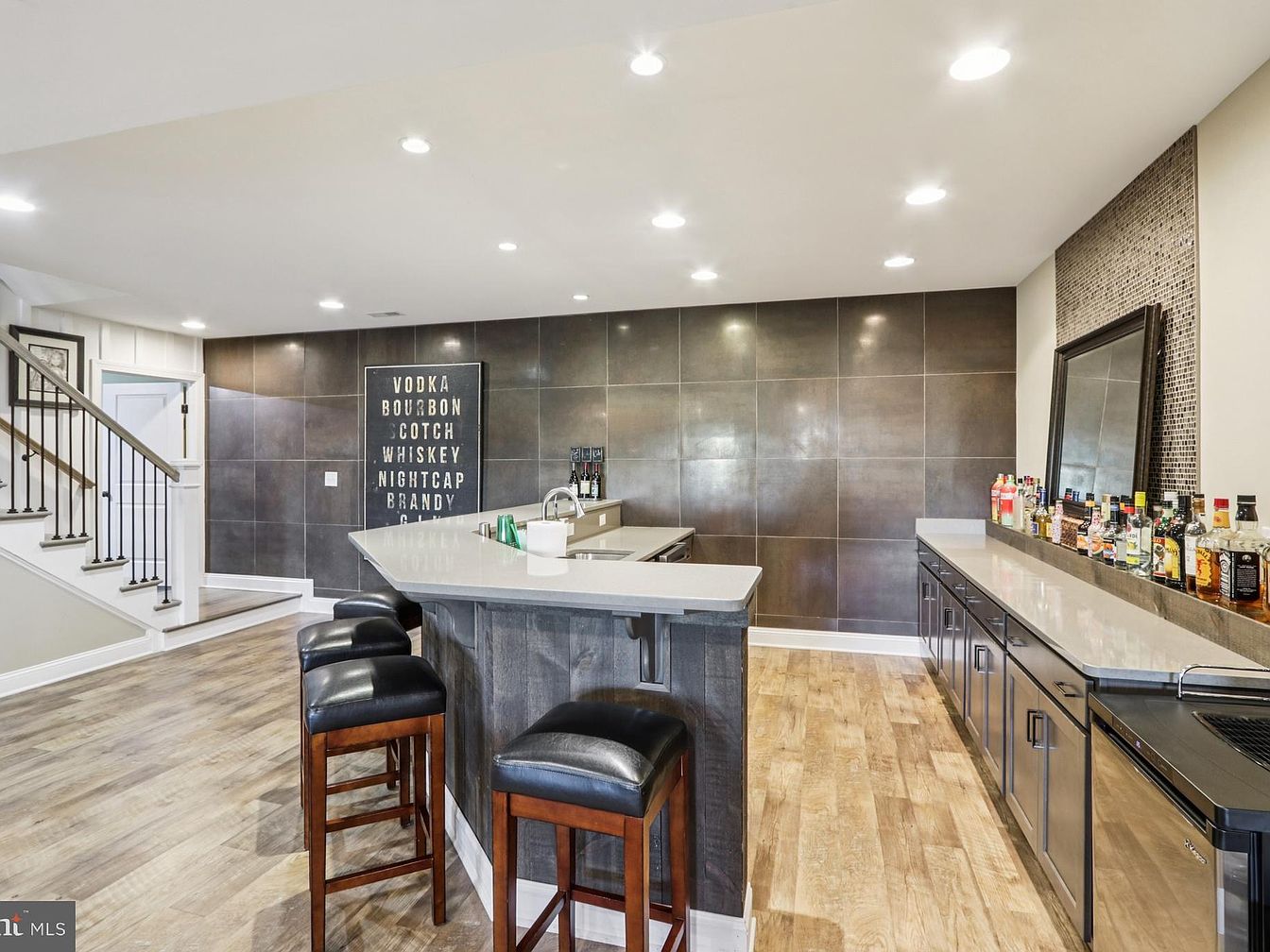 A spacious home bar featuring a large, L-shaped counter with a sleek, modern design and gray stone surfaces. Three high-backed barstools with dark leather seats and wooden legs line one side, inviting conversation and relaxation. The floor is finished in warm-toned wood planks, contrasting with the glossy, oversized charcoal wall tiles that dominate the backdrop. A striking framed black-and-white cocktail-themed print and a mirror hang above a long bar counter, which holds an array of colorful bottles. Recessed lighting in the ceiling bathes the space evenly, while the stairway and iron railings nearby add an open, connected feel.