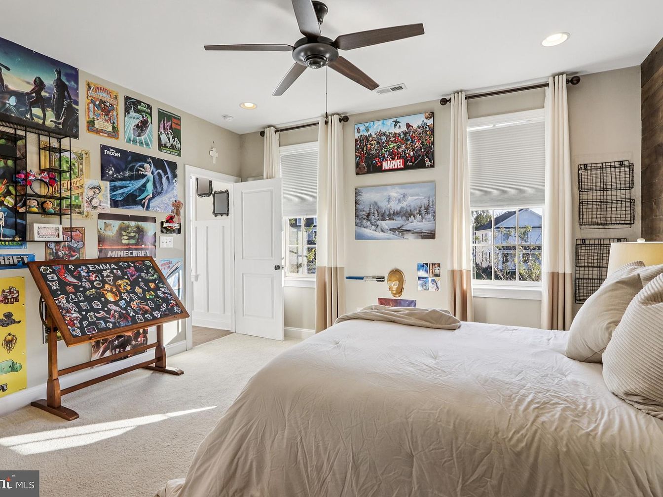 A spacious bedroom featuring light beige walls, white trim, and soft carpeting, illuminated by natural light from two large windows with white blinds and beige curtains. The queen-sized bed has a neutral comforter and plush pillows, positioned to the right of the image. The left wall is lively with colorful posters from movies, games, and comics, creating a playful and personal atmosphere. A wooden inclined desk or art station displays stickers and collectibles. A ceiling fan with dark blades hangs above. The room combines youthful energy with cozy comfort, blending modern touches and creative flair.