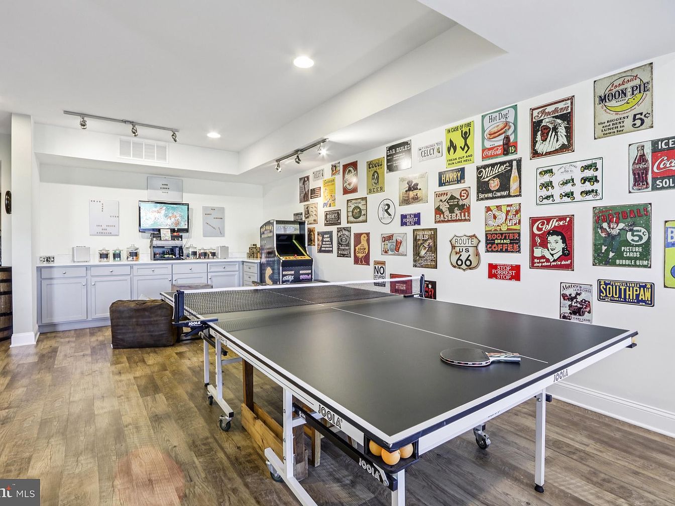 A spacious game room features a black ping pong table at the center, accompanied by a brown ottoman for seating. The back wall is adorned with a vibrant collection of retro-style metal signs in various colors, with themes ranging from old advertisements to classic Americana. The far side of the room hosts an arcade machine, a mounted flat-screen television, and a long counter with gray cabinetry, stacked with candy jars and other playful touches. Warm wood flooring and soft white walls contribute to a bright, lively atmosphere, while recessed and track lighting ensures the room is well illuminated.