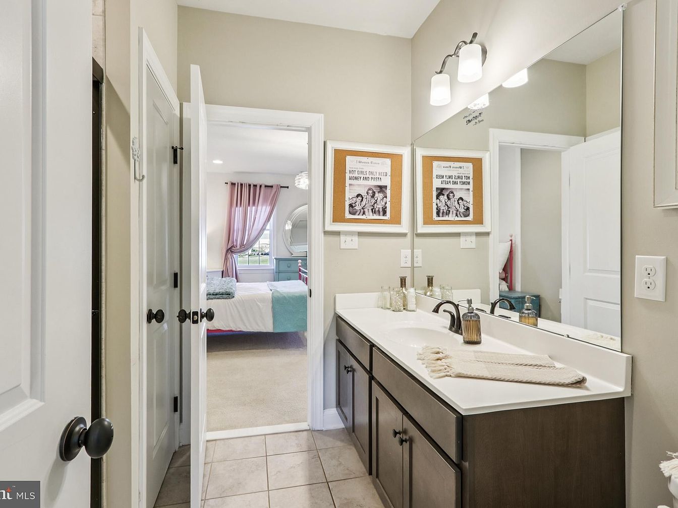 A bathroom with a neutral color palette features beige walls and light tiled flooring. The vanity has a double sink with a long, white countertop and dark wood cabinetry below, topped with decorative jars and a hand towel. Above the sink is a large, rectangular mirror that reflects two framed prints, which add a touch of character. Modern light fixtures with frosted glass shades illuminate the vanity area. The door opposite opens to a bedroom visible in the background, decorated with pastel accents, a turquoise blanket, and pink curtains that let in natural light, connecting the spaces visually and stylistically.