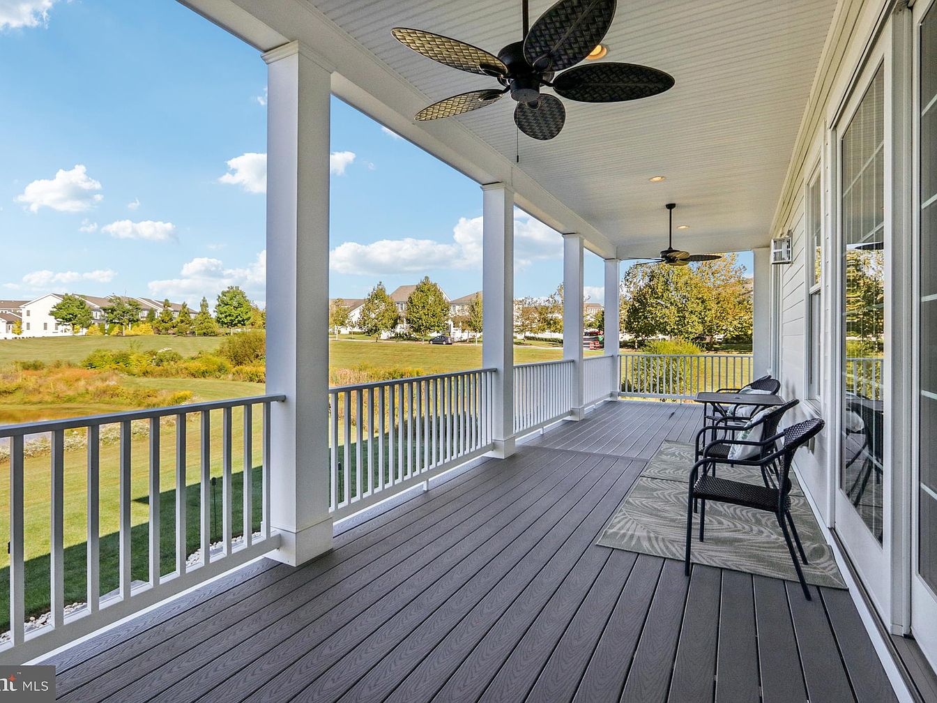 A spacious front porch features wide, plank-style flooring in a soft gray tone, bordered by tall white columns and classic white railings. Overhead, two large ceiling fans with leaf-shaped blades provide both style and comfort, while recessed lighting adds brightness. The porch faces a well-kept grassy lawn with unobstructed views of a neighborhood and open sky, creating a serene and inviting outdoor space. Two dark wicker chairs with a matching side table rest on a muted, patterned outdoor rug near large glass doors, completing a layout perfect for relaxing or socializing in comfort and style.