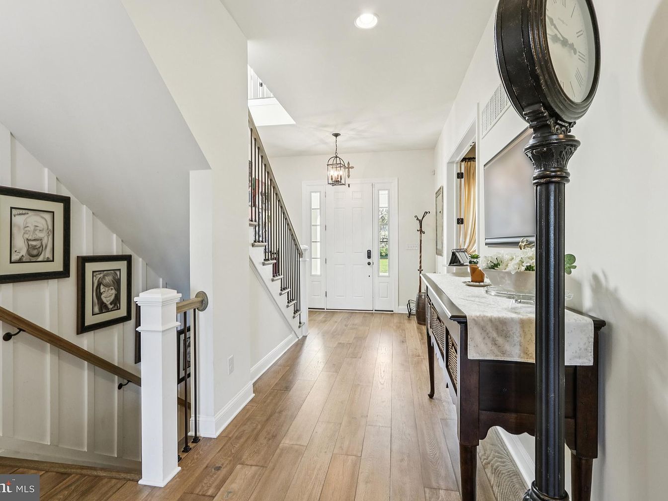 A bright and welcoming entryway with light wood flooring runs the length of the hall toward a white front door with glass sidelights. To the right, a dark wooden console table topped with white marble offers both elegance and utility, adorned with decorative accents and a white floral arrangement. A vintage-style standing clock adds a classic touch. The walls are painted soft white, adorned with framed caricature sketches near the staircase, which has wooden steps, crisp white railings, and dark balusters. Overhead, a lantern-style light fixture casts a warm glow, enhancing the space’s airy, fresh ambiance.