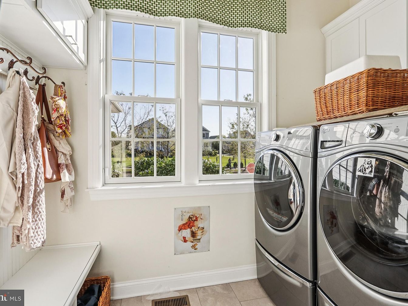 Bright, sunlit laundry room with large white-paned windows overlooking a green outdoor space. The walls are painted cream, creating a clean and airy atmosphere. Silver front-loading washer and dryer occupy the right side, topped by a woven wicker basket and a white storage box. To the left, a white bench sits below a set of ornate metal hooks holding coats, scarves, and bags. The bench has basket storage underneath. A small vintage-style illustration is mounted on the wall. Overhead, a green and white geometric valance adds a cheerful touch to the windows.