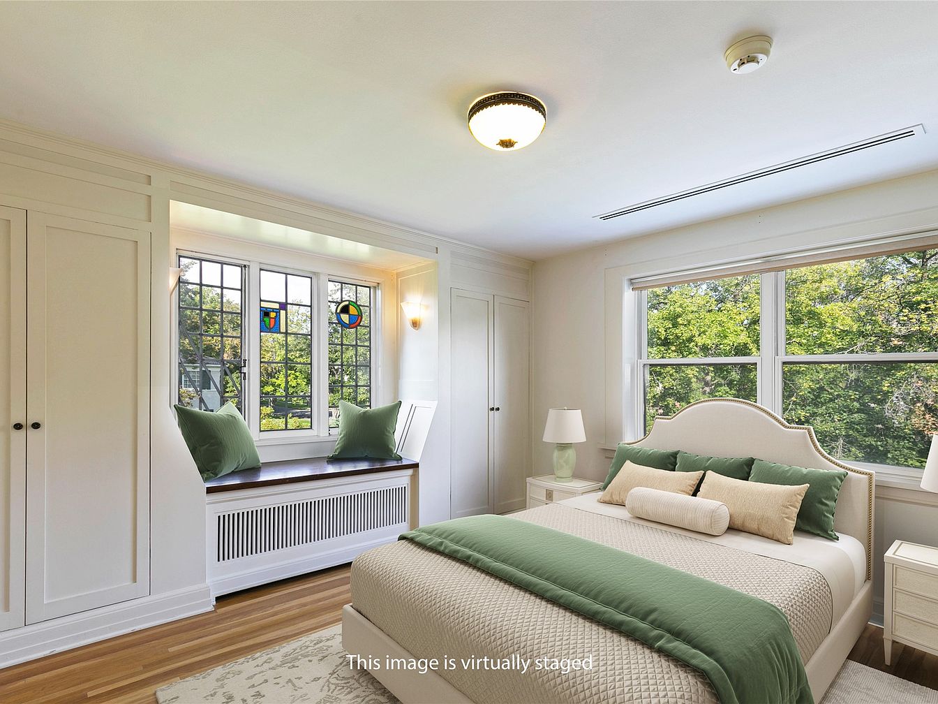 A serene bedroom features a light color palette with soft whites and muted greens creating a calming atmosphere. The bed is elegantly dressed in a textured beige quilt, complemented by plush green and cream pillows. A built-in window seat beneath large, bright windows invites relaxation, adorned with green cushions. Architectural details include sleek white cabinetry and molding, enhancing the space’s sophistication. Natural light floods through the windows, highlighting the hardwood flooring and lending warmth to the room. Subtle stained glass accents add a touch of character, harmonizing with the overall tranquil and refined aesthetic.