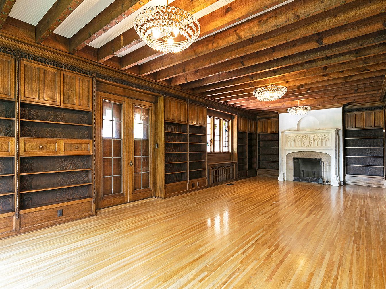 This spacious living room features rich wooden paneling with a warm tone that evokes a sense of comfort and history. The ceiling showcases exposed beams, adding a rustic charm. Large built-in bookshelves flank either side of an elegant white fireplace, which serves as a striking focal point. The floors are polished hardwood, enhancing the room’s bright and inviting atmosphere. Crystal chandeliers cast a soft glow, complemented by the natural light filtering through leaded glass windows. The symmetry of the design elements creates balance while the combination of wood and stone invokes an air of sophistication.