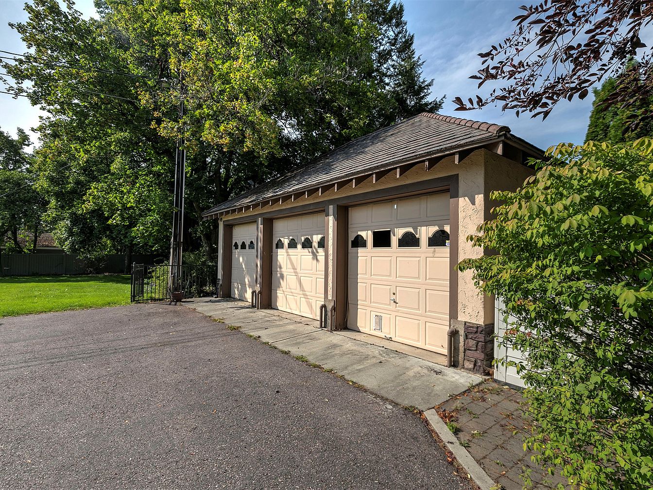 The garage displays a charming design featuring three large doors with an arched window motif. The exterior is a soft beige, accented by a textured stone base and dark trim. Above the doors, the overhanging eaves showcase decorative brackets, contributing to a vintage aesthetic. The roof has a warm, earthy tone, complementing the overall color scheme. In front, a spacious driveway is made of asphalt, lined with stone. Surrounding greenery offers a lush backdrop, providing natural contrast to the garage. The area conveys a harmonious blend of functionality and aesthetic appeal, typical of historic American homes.