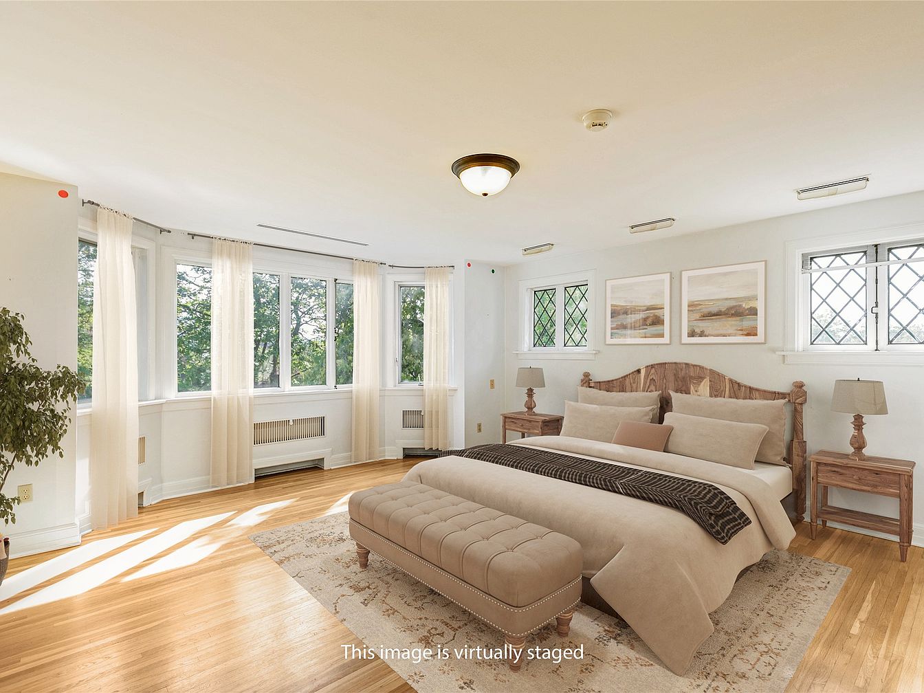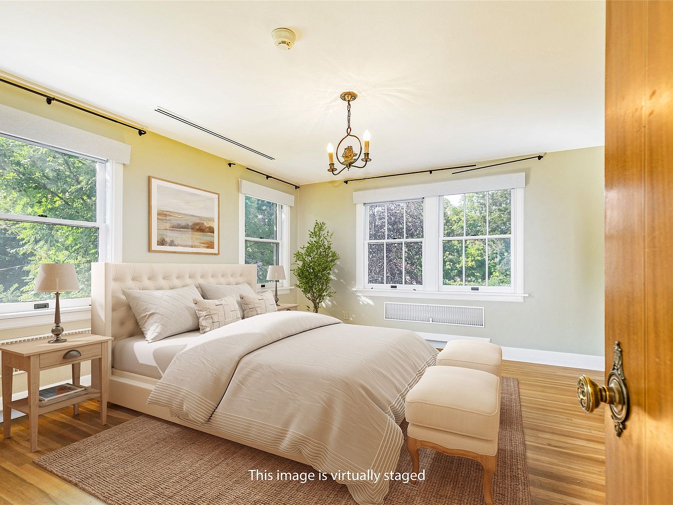 A spacious bedroom featuring large windows that fill the space with natural light. Soft beige walls complement a wooden bed frame with a carved headboard, adorned with neutral bedding. Two matching bedside tables hold stylish lamps, enhancing the room’s symmetry. A plush, tufted bench in front of the bed adds a touch of elegance, while a decorative area rug introduces a subtle pattern. Sheer curtains cascade from the windows, softly diffusing light and creating an airy atmosphere. The hardwood floor lends warmth, balanced by the simplicity of framed artwork on the walls, contributing to a serene, inviting ambiance.