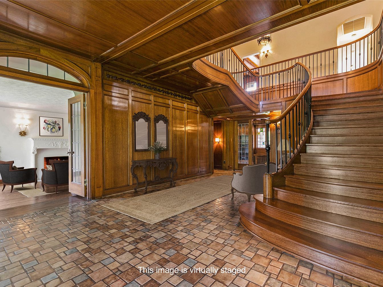 A grand foyer with rich wooden paneling and a sweeping staircase is showcased. The floor features a mosaic of dark and light tiles, adding dimension and character. To the left, an archway leads into a cozy sitting area with two armchairs and a decorative fireplace, highlighted by warm lighting from wall sconces. A console table with ornamental mirrors enhances the space’s elegance. The high ceiling boasts intricate woodwork, while tall windows allow natural light to filter through, creating an inviting atmosphere. Overall, the aesthetic reflects historic charm with a blend of sophistication and warmth.