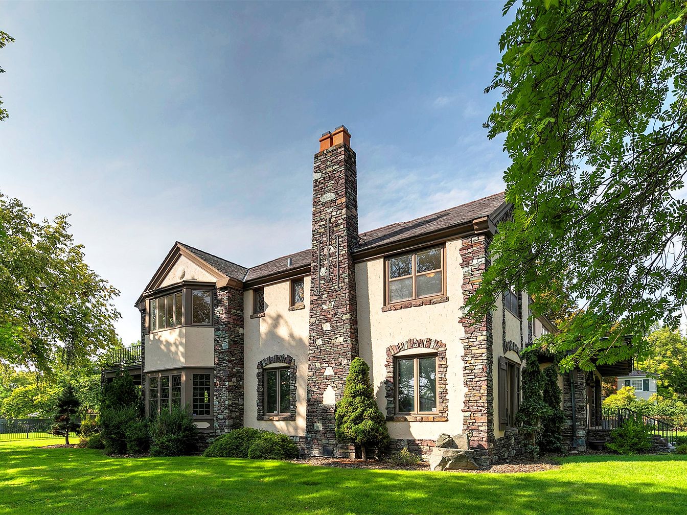 A stunning historic home features a combination of textured stone and smooth stucco siding, showcasing an elegant aesthetic. The structure includes a prominent stone chimney and intricately designed window frames. Its asymmetrical façade is complemented by carefully curated landscaping, with lush green grass and several manicured shrubs. The two-story design features a quaint bay window that protrudes gently, providing an inviting touch. Soft natural light fills the space, enhancing the earthy tones of the exterior while large windows allow visibility into the home. The roofline is traditional, enhancing the home’s classic architectural style.