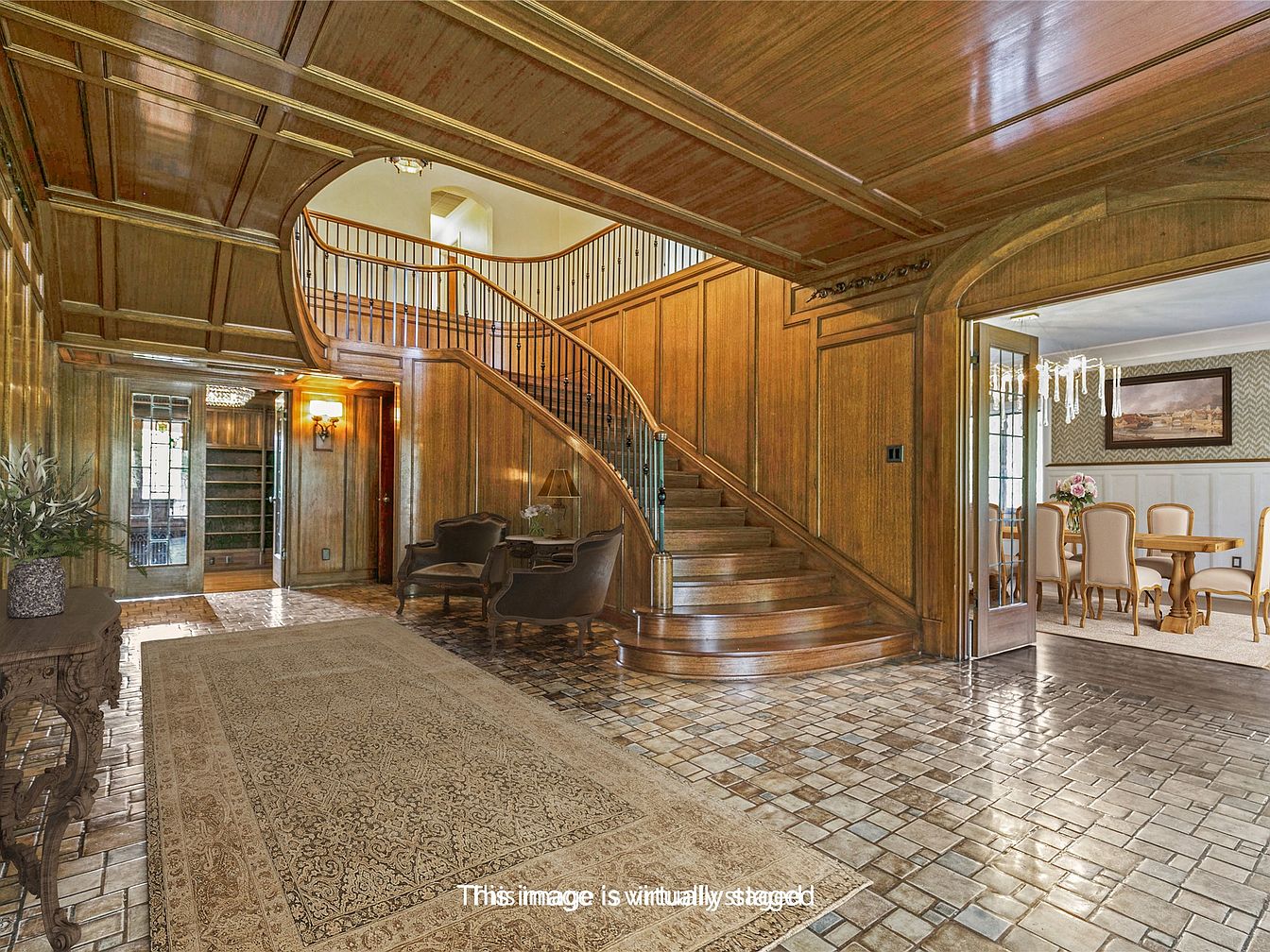 A grand entryway characterized by rich wooden paneling and a stunning staircase that spirals upward. The ceiling features a warm wood finish, enhancing the room’s elegance. A patterned area rug lays centrally on the polished tile floor, which showcases a blend of earthy tones, reflecting light in subtle ways. To the left, an intricately designed glass door opens into a well-lit space, while a pair of stylish armchairs provide a cozy seating area. Attention is drawn to the chandelier above, casting a soft glow, and the adjoining dining room is glimpsed through an open doorway, hinting at further sophistication.