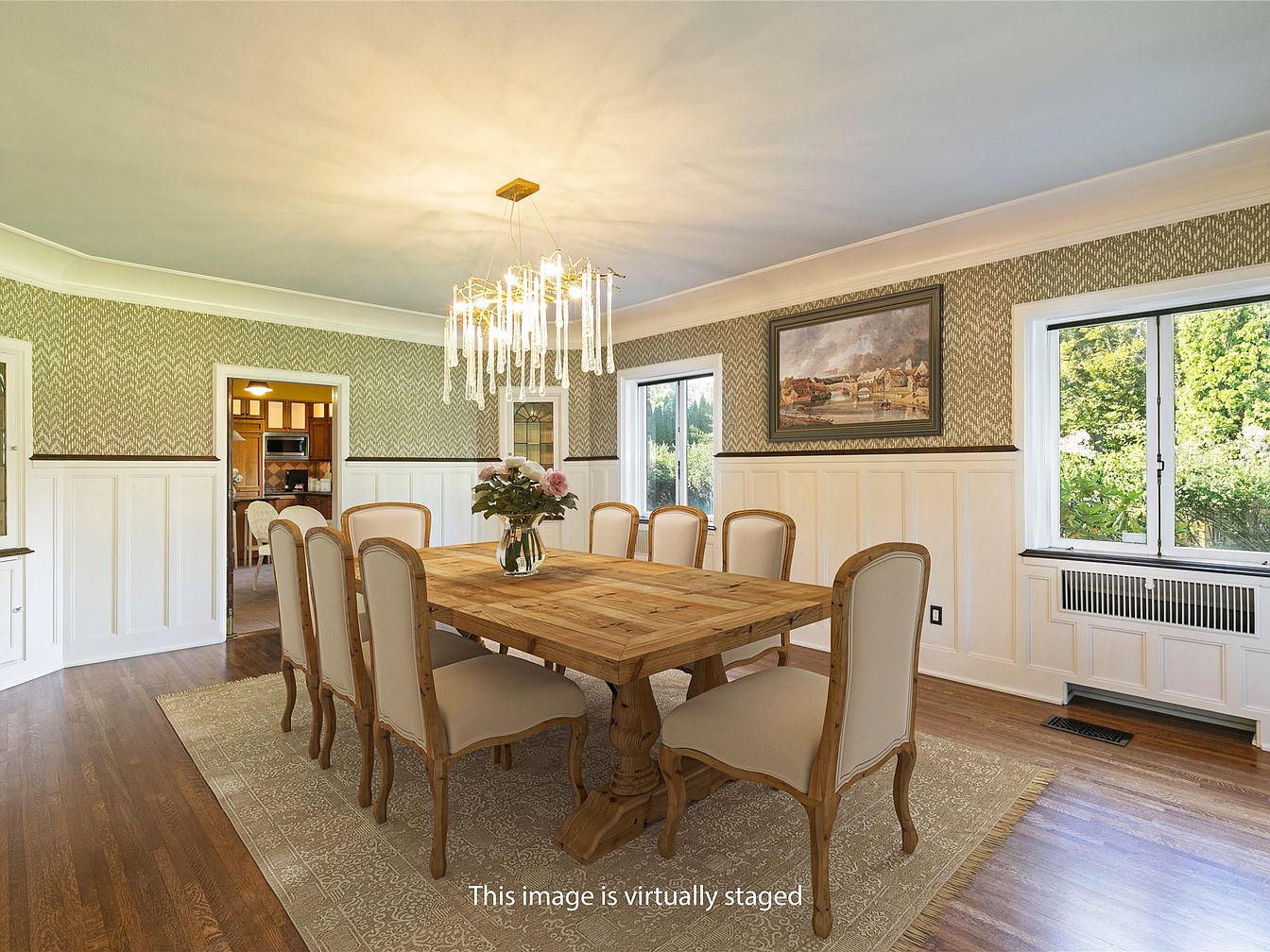 A warm and inviting dining room features a large wooden table surrounded by upholstered chairs, emphasizing a rustic charm. The walls display a sophisticated chevron-patterned wallpaper in subtle olive tones, paired with classic wainscoting that adds texture and depth. A striking chandelier with elongated glass accents casts a soft glow across the space, enhancing the inviting atmosphere. Natural light floods in from two large windows, revealing a lush green garden outside. A beautifully framed painting adorns one wall, contributing to the room’s elegance, while a decorative area rug anchors the seating arrangement, adding a cozy touch.