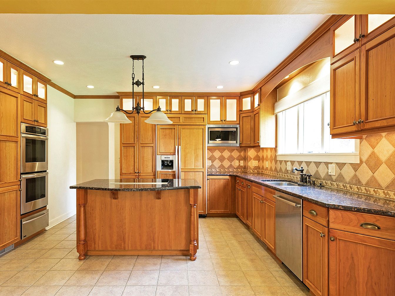 This spacious kitchen features warm wood cabinetry paired with a rich granite countertop, accentuating a classic yet welcoming aesthetic. The cabinetry is detailed with raised panel designs and glass inserts, allowing light to filter through. A central island provides functional space for meal prep, complementing the line of stainless steel appliances, including double ovens. The tiled backsplash boasts a diamond pattern in earthy tones, enhancing the inviting atmosphere. Natural light streams in through ample windows, illuminating the neutral wall tones and creamy tile flooring, creating a bright and open feel ideal for culinary activities and gathering.