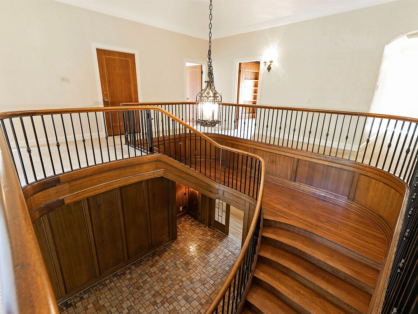 A beautifully crafted staircase featuring rich wooden elements and intricate railings. The sweeping curves of the staircase create a welcoming focal point while showcasing the elegance of the home. Warm hardwood textures contrast with the soft beige walls, enhancing the classic aesthetic. The landing is adorned with a chic, wrought-iron chandelier providing ambient lighting. A tiled floor below adds a touch of sophistication, with its mosaic patterns complementing the wooden details. Closed doors along the landing offer privacy, while the overall design exudes charm and timelessness, inviting a sense of grace and harmony in this historic space.