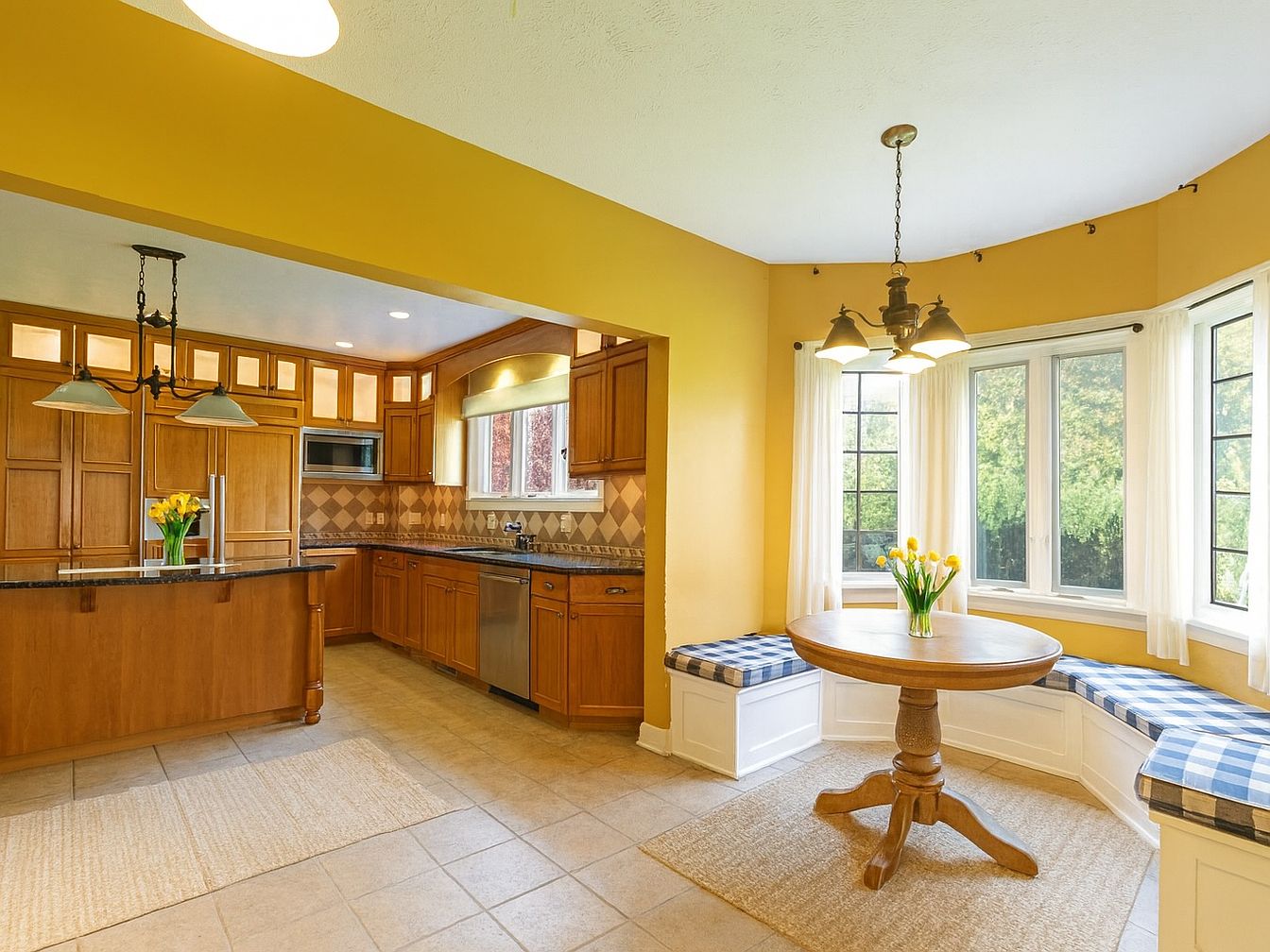 The kitchen showcases a bright and inviting layout, featuring a warm yellow color scheme that enhances natural light. Rich wooden cabinetry complements the polished black granite countertops, creating an upscale yet cozy atmosphere. The dining area includes a round wooden table accompanied by comfortable blue and white checkered cushions, nestled in a charming bay window. Large windows framed with sheer white curtains offer a view of the greenery outside, adding to the tranquility of the space. Architectural details such as pendant lights and patterned tile backsplashes elevate the aesthetic, making it an ideal gathering spot.