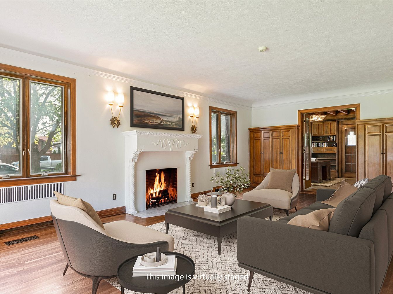 A spacious living room featuring a modern yet classic aesthetic. The room is brightened by large windows with wooden frames, allowing natural light to flood in. A cozy fireplace, adorned with intricate white molding, serves as a focal point, with a gentle fire flickering inside. Seating includes two stylish chairs with soft beige upholstery and a dark, contemporary sofa complemented by decorative pillows. A low coffee table sits atop a textured area rug, creating a warm gathering space. Rich wooden cabinetry provides both function and charm, while subtle wall sconces add ambient lighting, enhancing the inviting atmosphere.