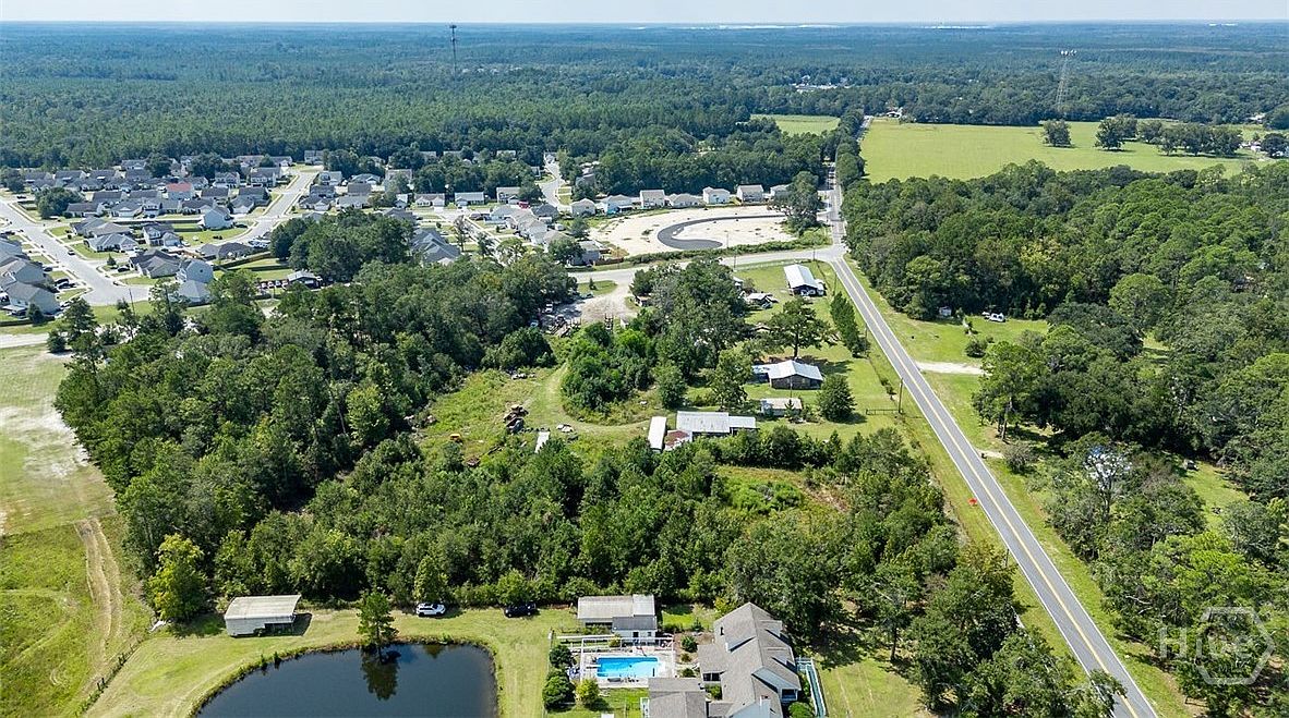 Aerial view of a large, tree-filled property bordered by a straight rural road on the right and a suburban neighborhood on the left. In the foreground, a reflective pond sits next to a fenced area with a swimming pool and several small outbuildings. Scattered throughout the property are multiple structures, open grassy spaces, and clusters of mature trees that hint at both residential and utility areas. Dense woods create a natural barrier along one edge of the property, while the background reveals orderly neighborhoods and expansive farmland reaching to the horizon, creating a blend of rural tranquility and suburban convenience.