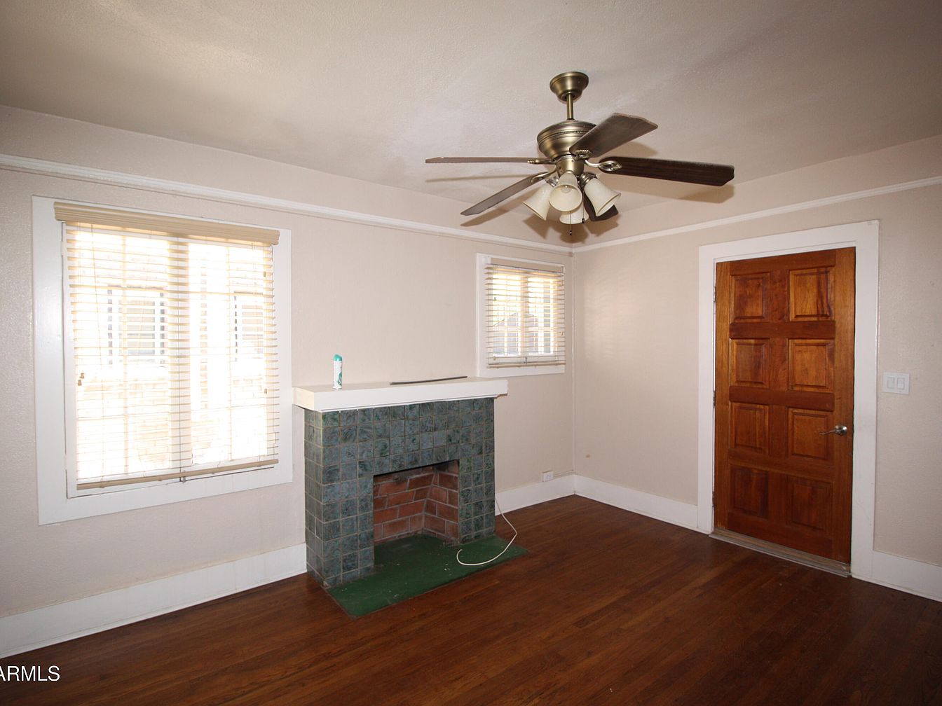A small living room features a wooden floor with a warm brown finish, adding a classic touch. At the center of one wall is a vintage fireplace with greenish-blue tiles and a red brick interior, topped by a white wooden mantel that stands out against beige walls. Two windows above the fireplace bring natural light, framed by white molding and fitted with simple wooden blinds. A solid wooden door, stained in a medium brown, complements the floor. Overhead, a brass ceiling fan with five wooden blades and four glass-shaded bulbs provides both light and ventilation for the space.