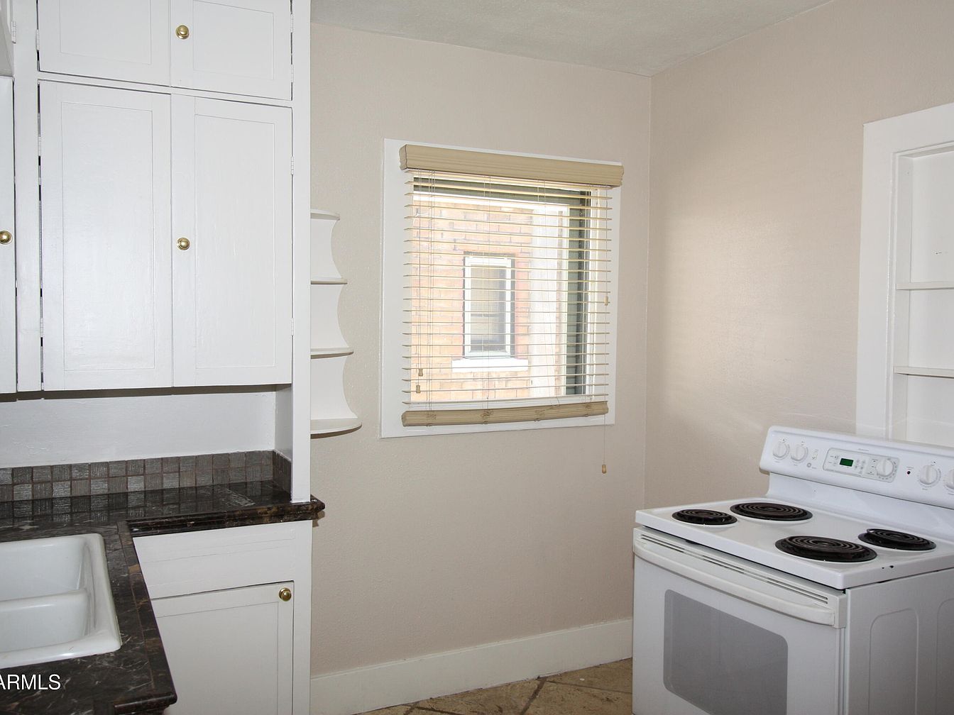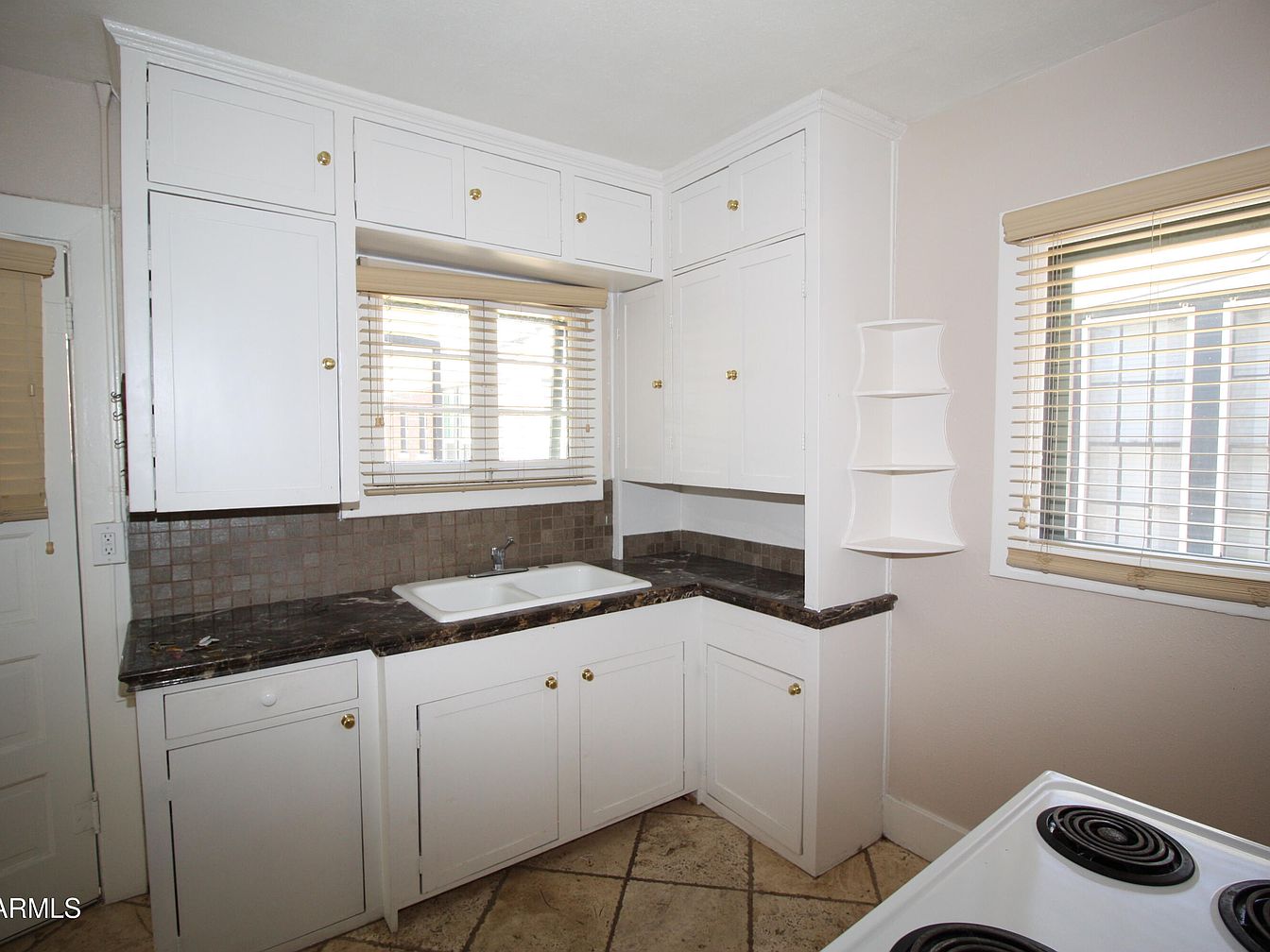 Small kitchen with a traditional layout, featuring off-white upper cabinets with gold-tone knobs. Countertops are dark marble-look, contrasting with the light cabinetry, and extend around a corner with a shallow, classic sink. There are built-in open shelves flanking a window with wooden blinds, providing natural light and a soft warm cast. The stove is electric, freestanding, and white, set against a plain beige wall that matches the subtle color palette of the room. The tiled floor has a brown and beige diamond pattern. An arched entryway leads to an adjacent room, adding vintage architectural character.
