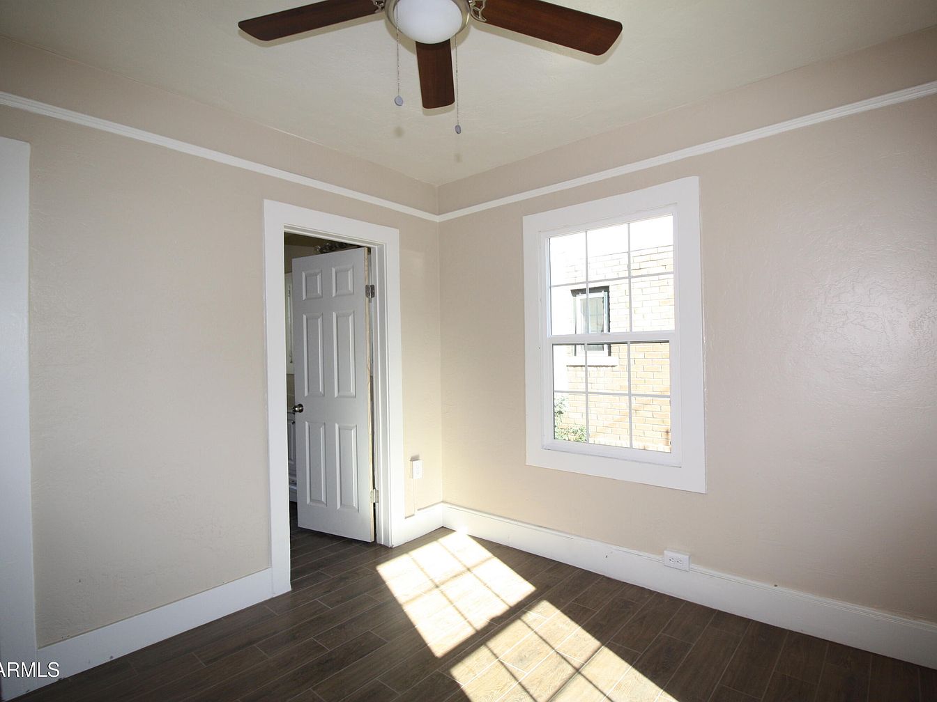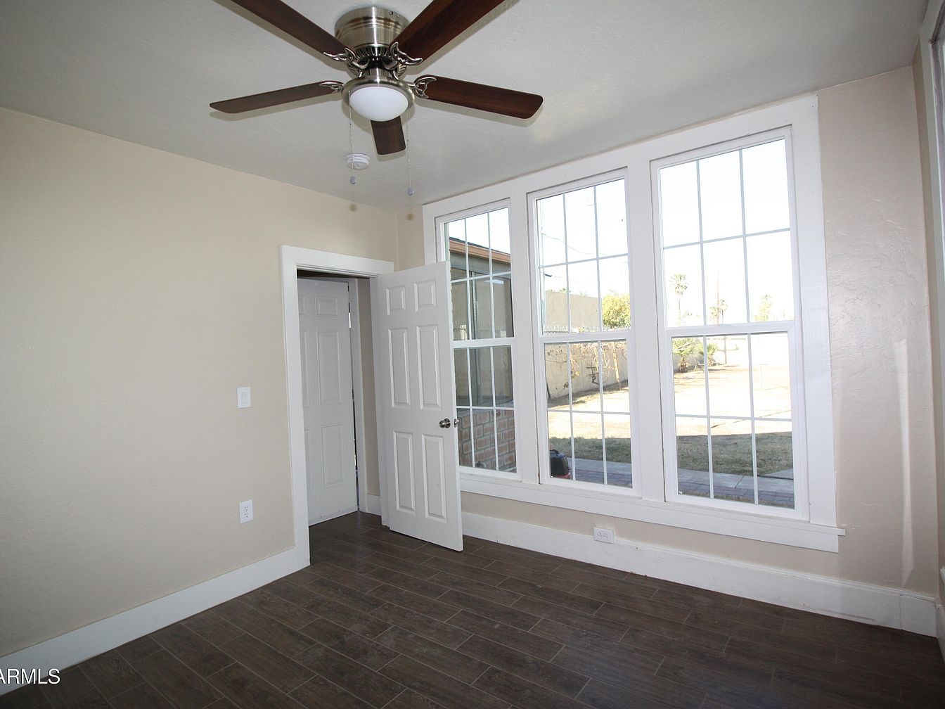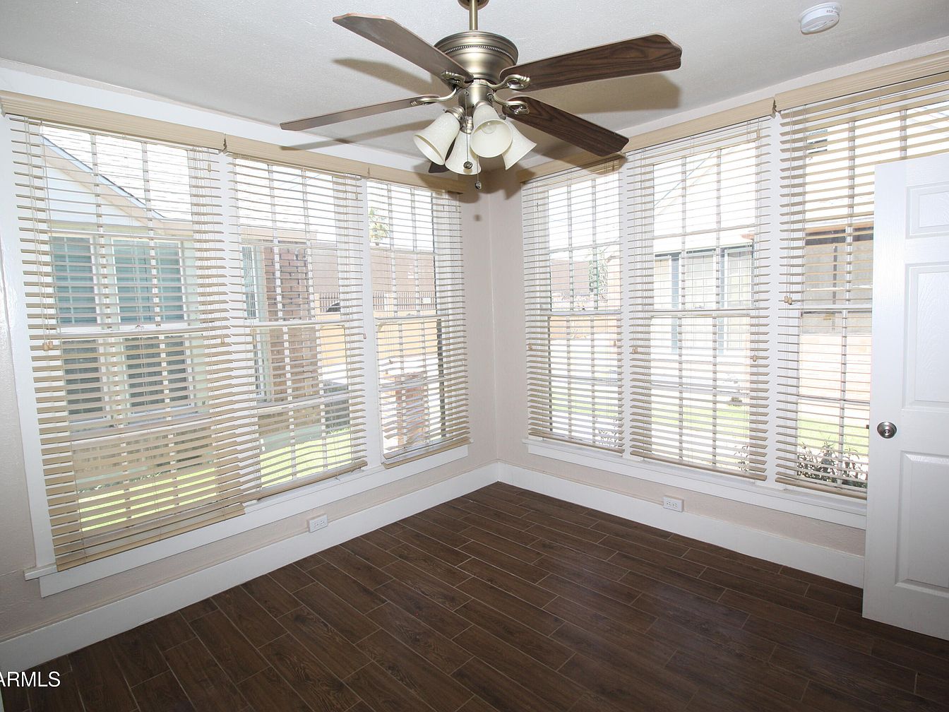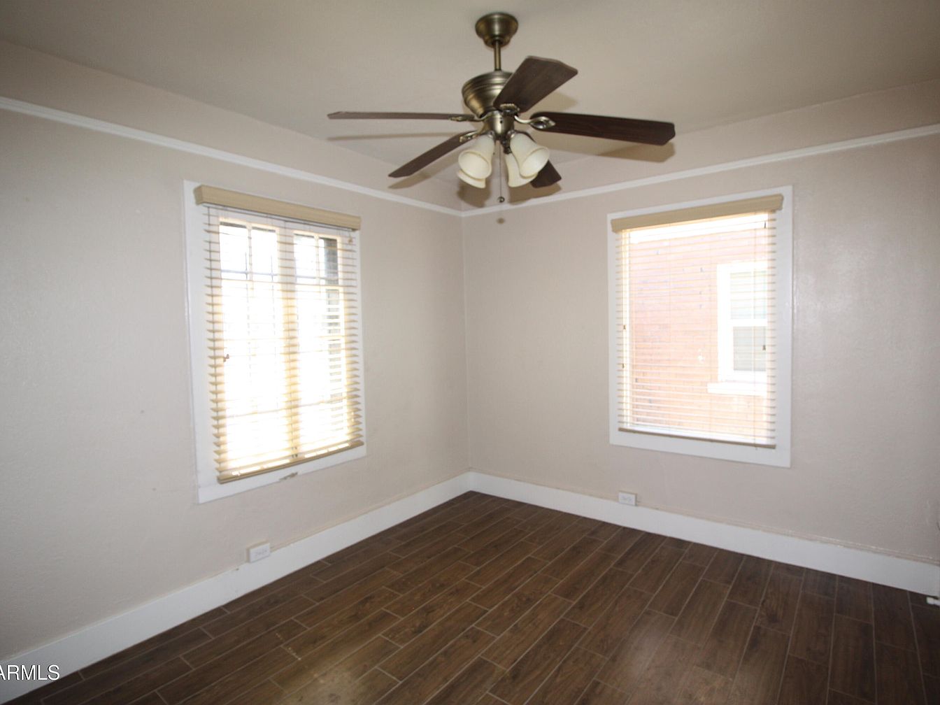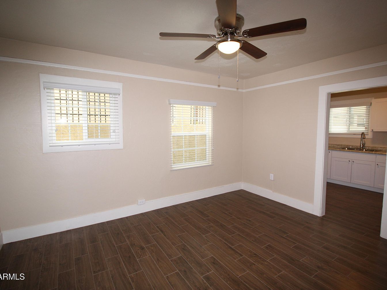 A compact room featuring warm beige walls with crisp white trim and baseboards. Two large windows with white blinds allow natural light to brighten the space. The floor is covered in wood-look tile arranged in a staggered pattern, providing a rustic touch. A ceiling fan with five dark wooden blades and a central light fixture adds functionality and a classic feel. An open doorway leads into a kitchen with white cabinetry and stainless steel fixtures. The overall atmosphere is airy and neutral, making it adaptable to various decor styles while maintaining a cozy, inviting environment.