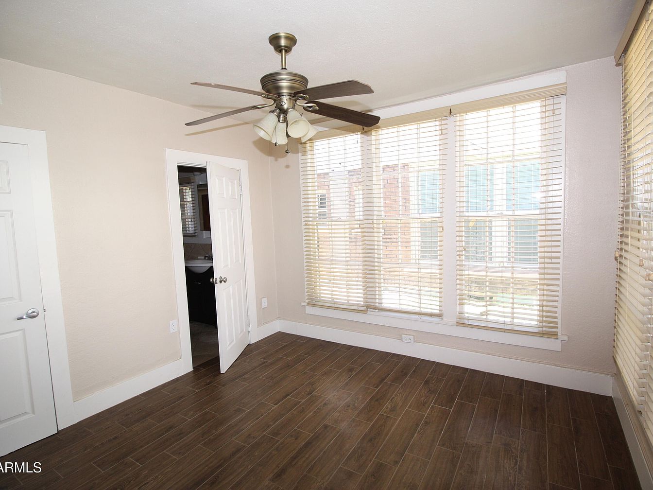 A bright, unfurnished bedroom featuring large windows on two walls, which let in ample natural light through horizontal blinds. The flooring is medium-toned wood or wood-look tile laid neatly throughout the space, creating a warm and inviting feel. The walls are painted a soft beige, accented by crisp white baseboards and trim, adding a clean, classic touch. Two doors are visible: one slightly ajar, leading to a small bathroom with a pedestal sink, and another closed, possibly a closet. Overhead, a brushed nickel ceiling fan with multiple light fixtures serves both decorative and functional purposes.