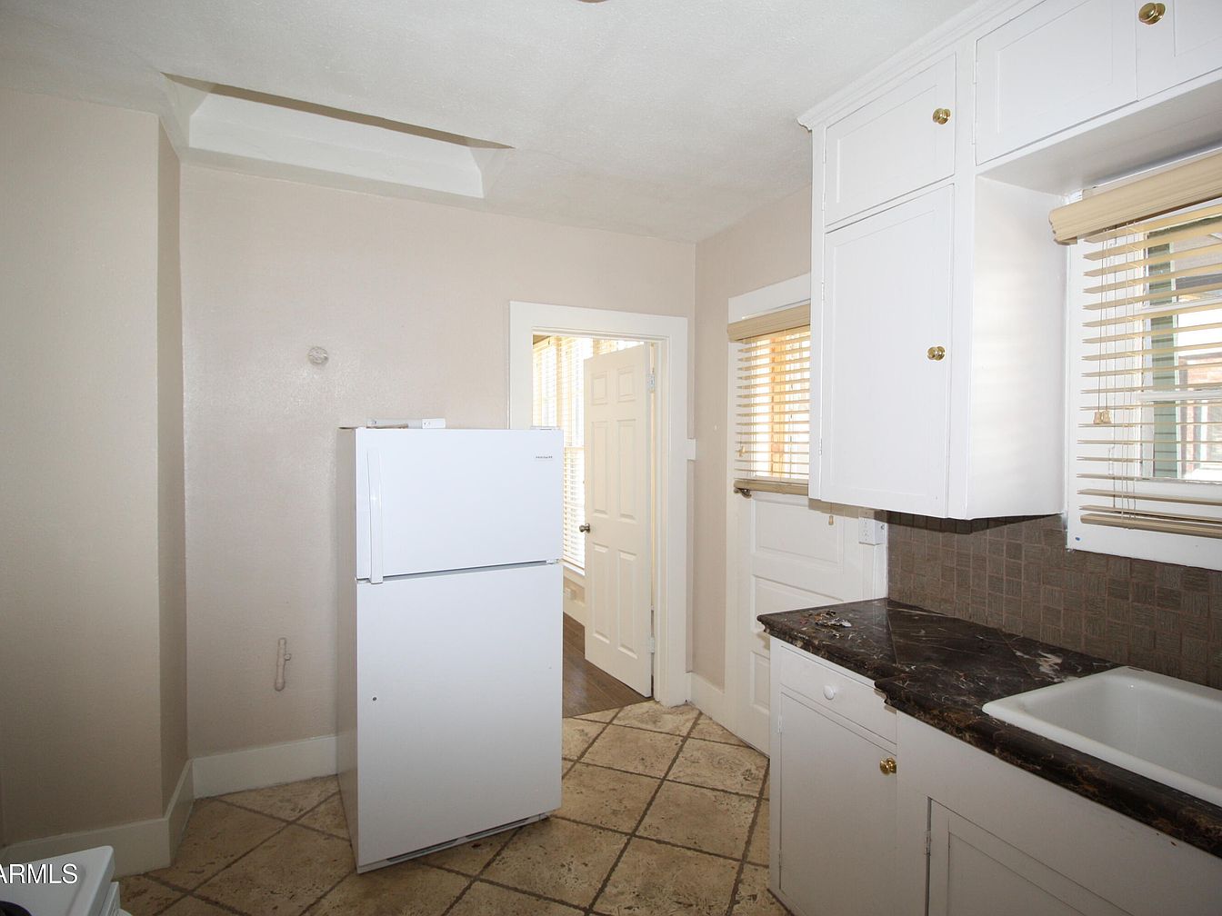 Compact kitchen corner featuring a white refrigerator placed against a light beige wall, with an adjoining doorway leading to another room. The cabinetry above and below the counter is painted white with simple brass knobs, contributing to a clean and traditional look. The countertops are dark with a brown marbled pattern, contrasting against the white cabinetry. Two windows with wood slat blinds let in ample natural light, highlighting the neutral color palette. The floor is tiled in large, beige squares with visible grout lines, adding texture and durability to the space. Architectural details remain minimal, focusing on functionality.