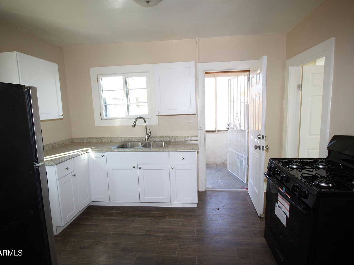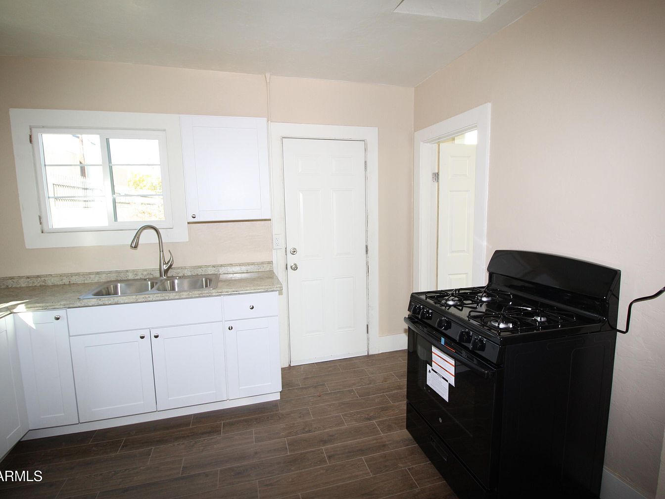 Simple and functional kitchen space with white cabinetry, brushed metal hardware, and neutral stone-style countertops. A double-basin stainless steel sink sits below a large window that lets in natural light. To the right, a modern black gas stove adds contrast against the white cabinets. The floor is a dark wood-look tile, providing warmth and a traditional touch. Light beige walls add a subtle, clean backdrop, while a door with a white wooden frame opens to an enclosed porch or utility space, letting in more light and creating an open, airy feeling. The overall aesthetic is clean and contemporary.
