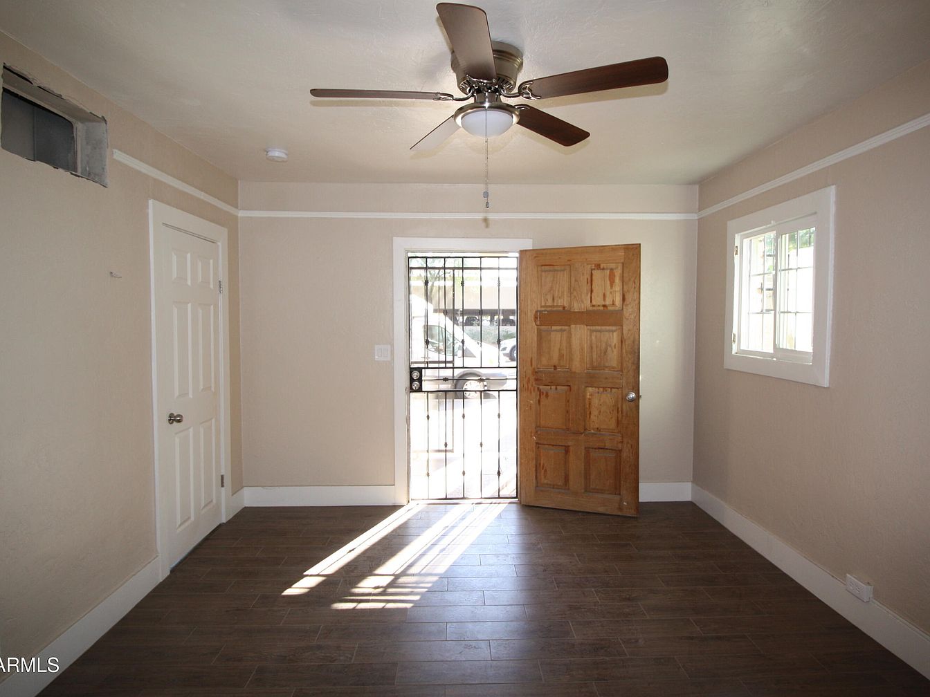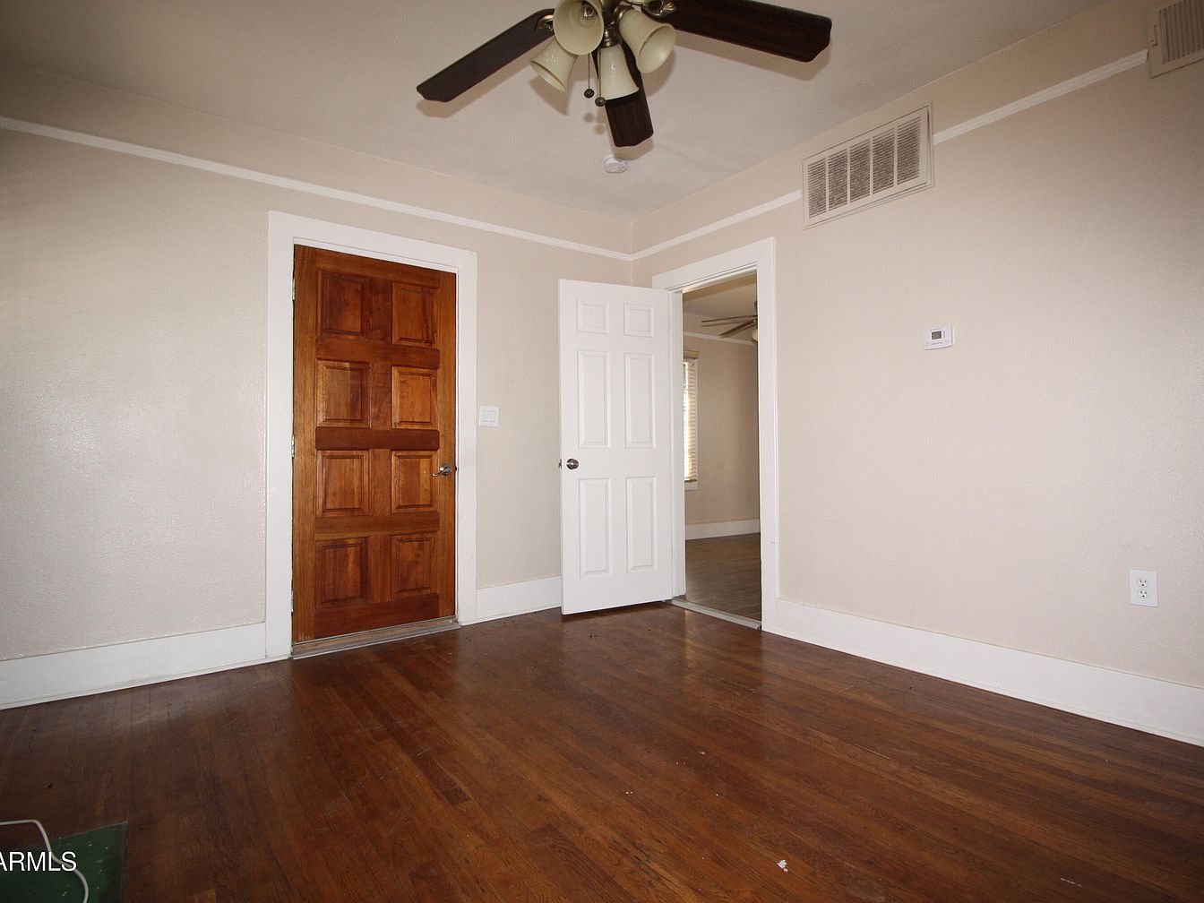 Warm wooden floors span the space, complemented by neutral beige walls with crisp white trim along the baseboards and around the doors. A rich, paneled wooden door gives the room classic character, while a simple white door stands open, connecting to another room with natural light streaming in. A ceiling fan with dark blades and beige glass light fixtures is mounted overhead. Air vents above the entry provide functional detail, and the overall look is clean, minimal, and inviting, with a subtle vintage feel created by the wood elements and traditional room proportions.