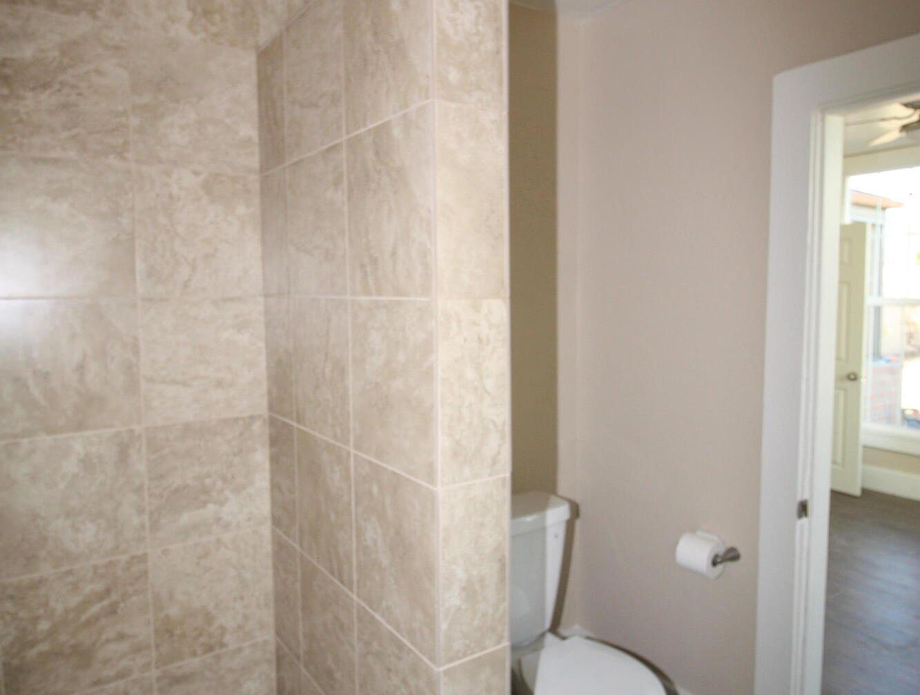 Tan ceramic tiles form the wall of a walk-in shower, occupying the left half and extending out to create a partial privacy barrier. To the right, a white toilet with a roll of toilet paper mounted on the wall sits adjacent to a softly painted beige wall. The clean lines and neutral color palette lend a calm, understated elegance to the small space. A white trim outlines the open doorway, through which another room with dark wood flooring and bright sunlight streaming in from tall windows is visible, contrasting the warmth of the bathroom’s earthy tones with the brightness beyond.