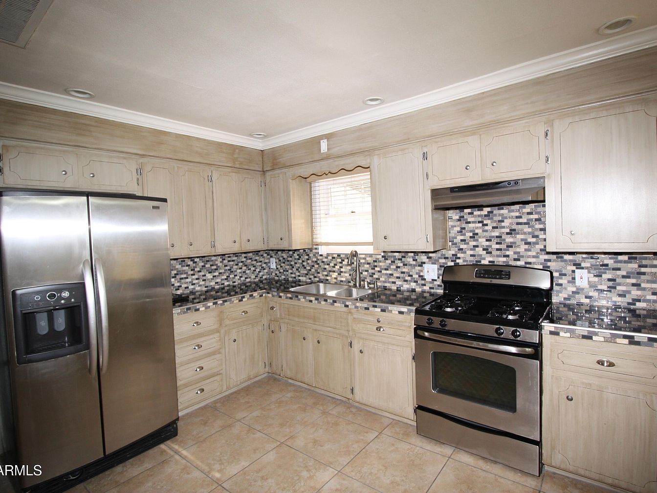 A spacious kitchen features light, weathered wood cabinetry lining two walls, accented by chrome hardware. The countertops are dark and glossy, complementing a geometric mosaic tile backsplash in shades of gray, black, and white. Modern stainless steel appliances, including a large refrigerator with a water dispenser and a gas stove with oven, create an updated look. A stainless steel double sink sits beneath a window with wooden blinds and a scalloped wood trim above. The flooring consists of large beige ceramic tiles, contributing to a neutral, earthy base. Crown molding adds a refined finishing touch to the ceiling.