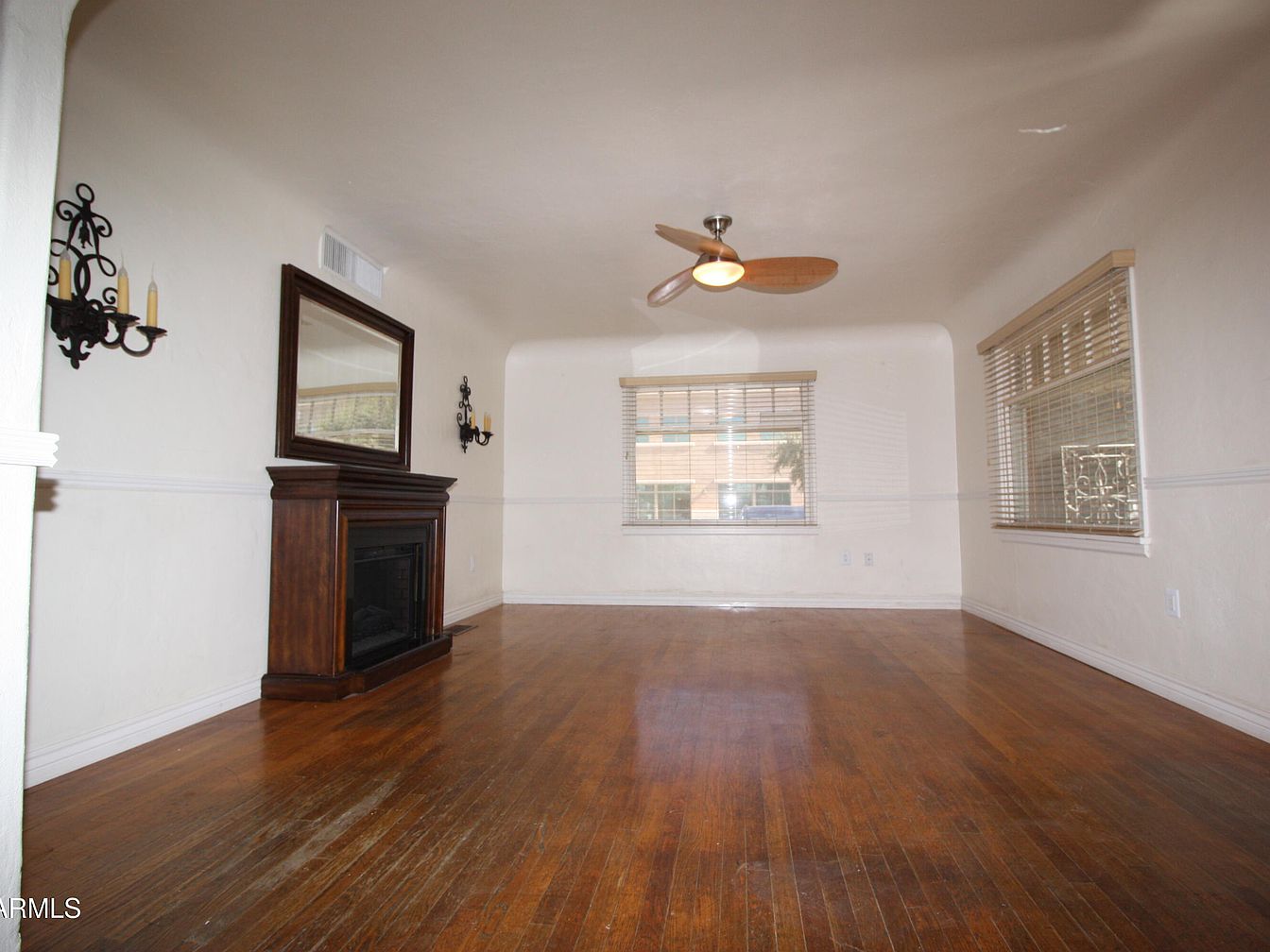 A spacious living room with honey-colored hardwood floors and creamy off-white walls. Two large windows with horizontal blinds flood the space with natural light, while curved ceiling edges lend a soft, vintage feel. A dark wood fireplace anchors the far end, topped by a matching framed mirror. Ornate wrought iron wall sconces with candleholders frame the fireplace, adding a touch of classic elegance. The ceiling features a distinctive modern fan with light and wood-toned blades as a focal point. Overall, the room combines period charm with clean, neutral tones and simple architectural details.