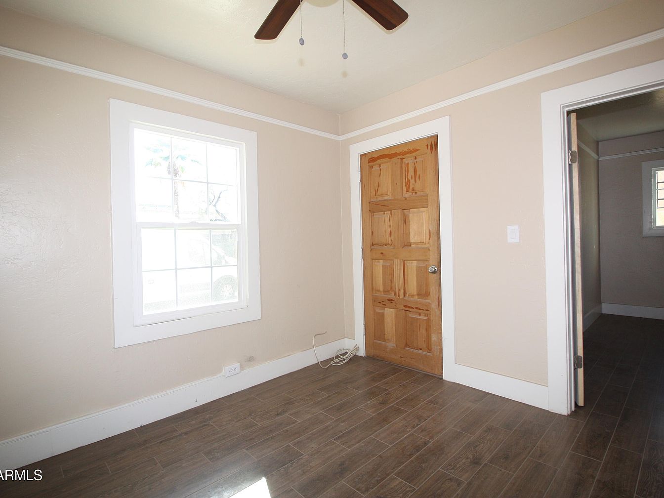 A small bedroom corner features warm beige walls and crisp white trim, creating a soft, welcoming atmosphere. A single, large window with grid panes allows natural light to brighten the space, illuminating the wood-look ceramic tile flooring. The door exhibits a rustic, unfinished wood appearance, adding character and texture. Adjacent is an open doorway leading to another similarly styled room. A white electrical outlet and coiled cable rest near the baseboard. The ceiling holds a dark wood ceiling fan, hinting at comfort for warm days. Overall, this area feels cozy yet simple with understated, classic historic touches.