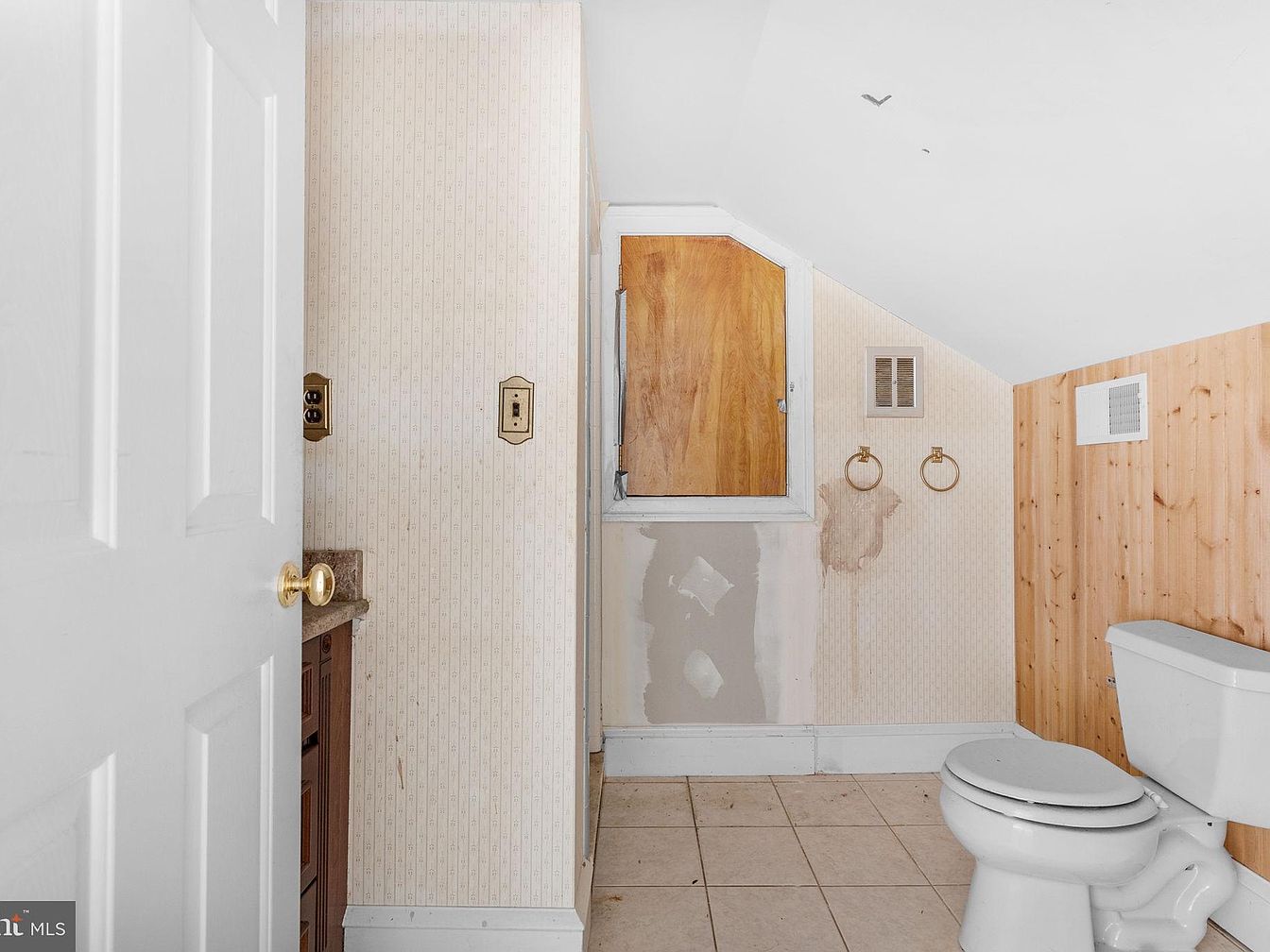 This small bathroom showcases a blend of vintage and functional elements. The walls feature pale, patterned wallpaper contrasted by warm wooden paneling, adding texture. A corner toilet takes up minimal space, while a granite countertop offers practicality. An octagonal window with wooden trim brings in light and charm, although it’s partially obscured. Two towel rings mounted on the wall enhance functionality. The flooring is tiled, maintaining a clean look. Overall, the layout emphasizes efficient use of space, combining nostalgic aesthetics with contemporary needs, ideal for both relaxing and everyday convenience.