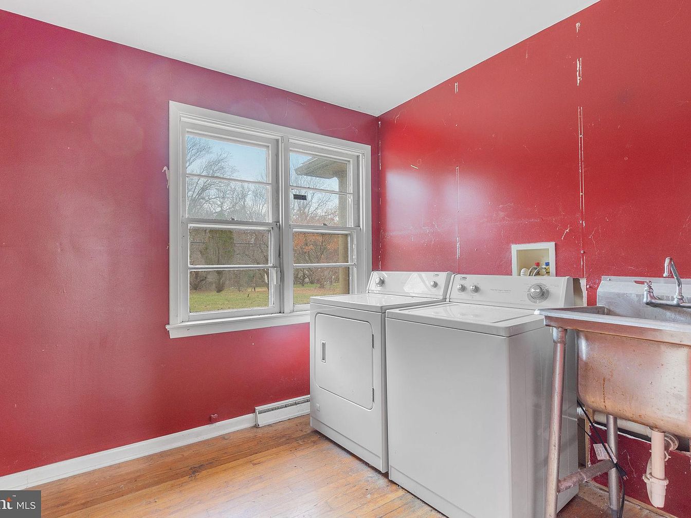This laundry room features a striking red accent wall, giving the space a bold atmosphere. Two modern washing machines sit side by side, showcasing sleek designs with clear control panels. Natural light floods in through a large window, revealing a grassy outdoor view that adds vibrancy to the room. Wooden flooring contributes warmth, contrasting with the bright red walls. A vintage-style utility sink, crafted from metal, stands beside the machines, enhancing the room’s functional appeal. The overall design balances practicality with character, making it both an efficient workspace and an inviting corner of the home.
