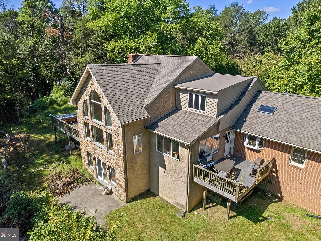 The image reveals the exterior of a historic American home, showcasing a unique blend of materials. The prominent stone façade, featuring large, textured stones, contrasts with the smooth, light-colored stucco on the upper part of the building. Expansive windows invite natural light, framed by rich greenery surrounding the property. A spacious wooden deck, designed for outdoor relaxation, extends from the main level, complete with a grill and planters. The roof consists of varied materials, adding visual interest, while the backdrop of lush trees enhances the serene setting, creating a welcoming atmosphere embraced by nature.