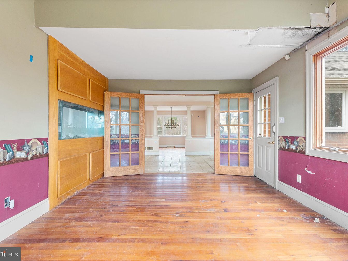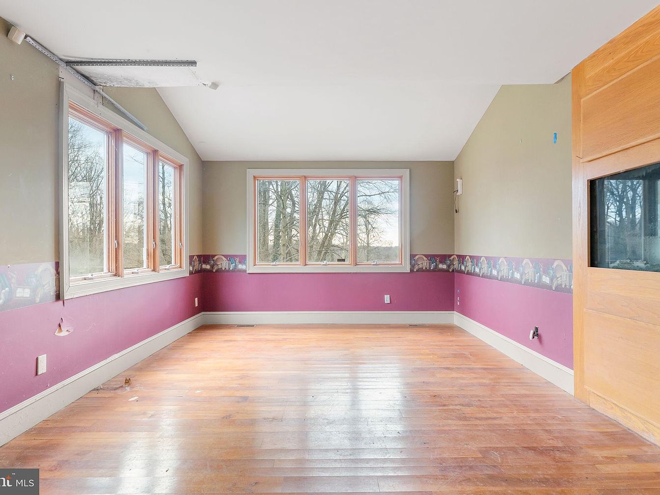 This living room features large, bay windows that invite natural light and offer views of the surrounding trees. The walls are a muted olive green, contrasting with a vibrant burgundy wainscoting, which showcases a whimsical border of rural scenes. The warm, hardwood flooring adds a cozy element to the space. Architectural details include a wooden panel door with a glass insert, enhancing the room’s character. The absence of furniture highlights the room’s spaciousness, suggesting potential for personalization. Overall, it combines rustic charm with a vibrant color palette, creating a welcoming atmosphere.